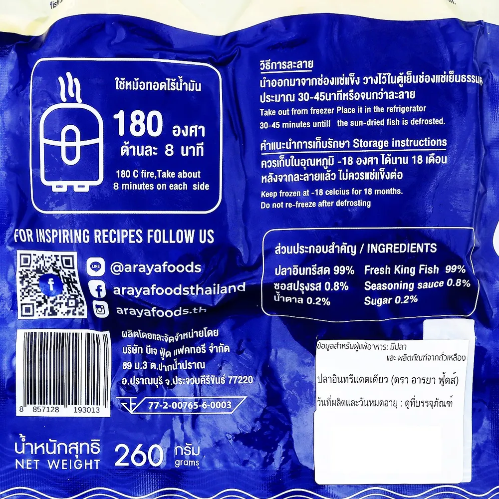 อารยา ฟู้ด ปลาอินทรีแดดเดียวปราณบุรี 260 ก.
