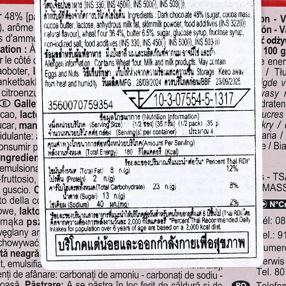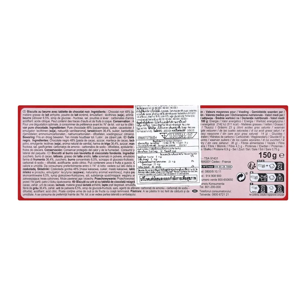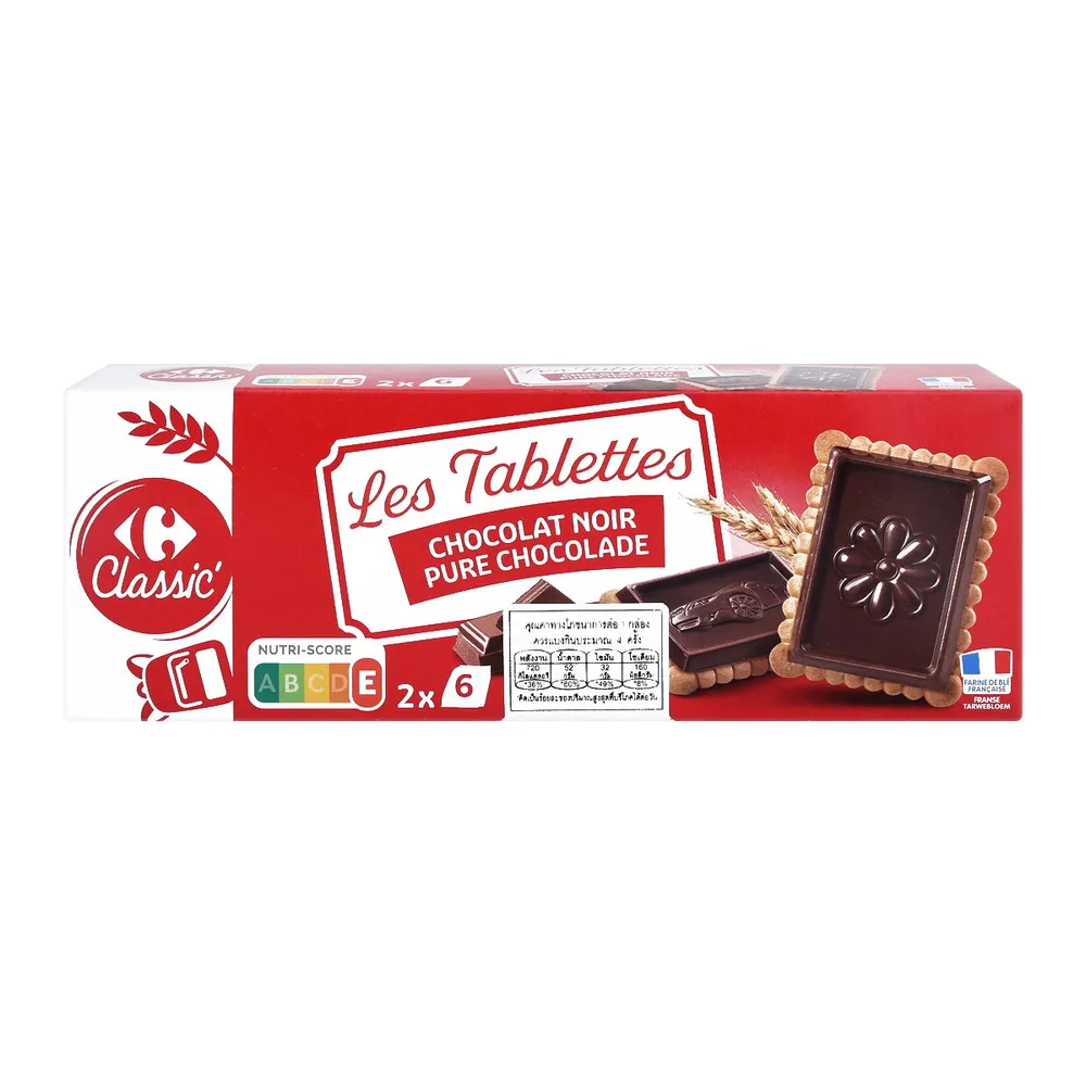 คาร์ฟูร์ เลส เทเบิลเทส ช็อกโกลาต์ นัวร์ บิสกิตเนยกรอบราดด้วยดาร์กช็อกโกแลตเข้มข้น รสชาติกลมกล่อมจากความหอมมันของเนยและความเข้มข้นของดาร์กช็อกโกแลต เหมาะสำหรับทานเป็นของว่างหรือขนมหวานที่อร่อยทุกเวลา!<br />