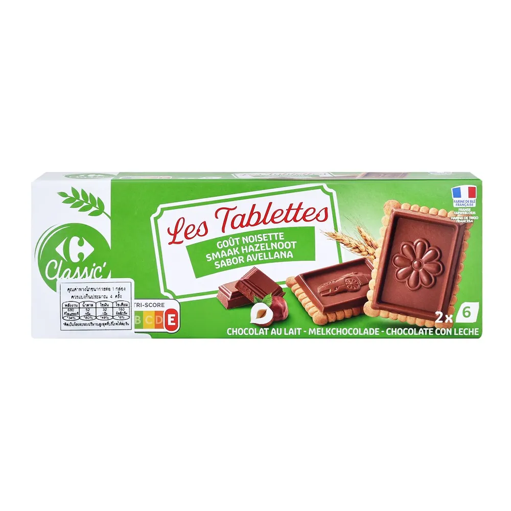 คาร์ฟูร์ เลส เทเบิลเทส กูต์ นัวเซทส์ ช็อกโกลาต์ อู เลต์ บิสกิตเนยกรอบราดด้วยช็อกโกแลตนมและเฮเซลนัท รสชาติหอมมันจากเฮเซลนัทและช็อกโกแลตนม อร่อยเต็มคำ เหมาะสำหรับทานเป็นของว่างหรือขนมหวานในทุกช่วงเวลา!<br />