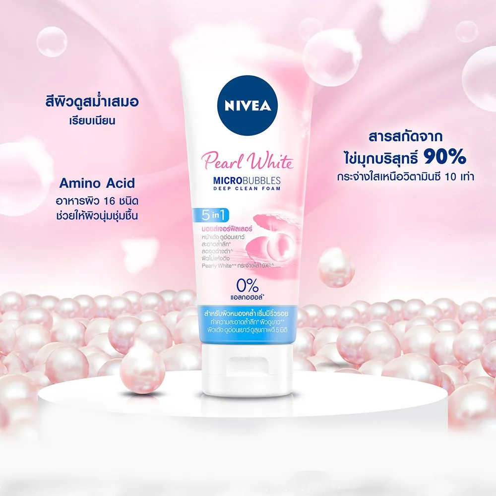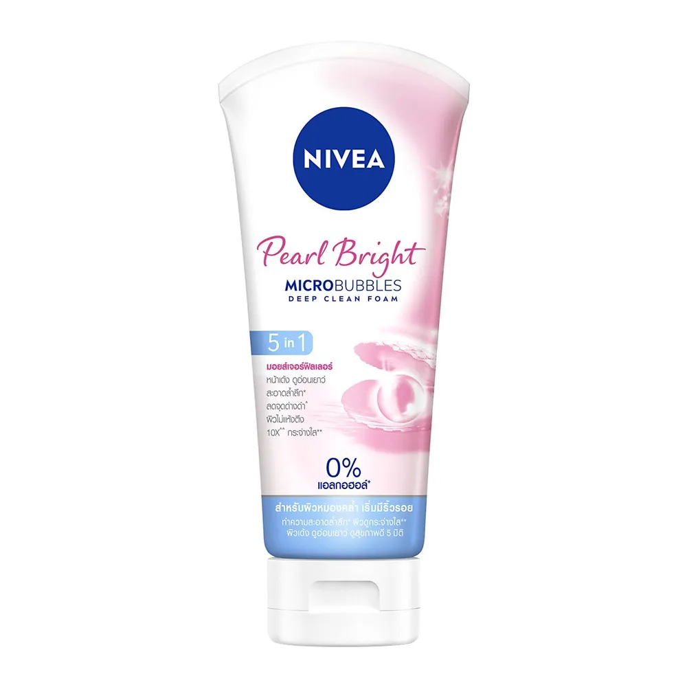 <p>นีเวีย เพิร์ล ไบร์ท 5อิน1 มอยส์เจอร์ฟิลเลอร์ โฟม<br /><br />โฟมล้างหน้าสำหรับผิวหมองคล้ำ เริ่มมีริ้วรอย ทำความสะอาดล้ำลึก พร้อมเข้าบำรุงด้วยเซรั่มไข่มุก และ Pearly Bright ดูกระจ่างใส 10X ผสานมอยส์เจอร์ฟิลเลอร์ให้ผิวดูกระจ่างใส เด้ง ดูอ่อนเยาว์ ดูสุขภาพดี 5 มิติ<br /><br />- นีเวีย เพิร์ล ไบร์ท 5อิน1 มอยส์เจอร์ฟิลเลอร์ โฟม<br />- โฟมล้างหน้าสำหรับผิวหมองคล้ำ<br />- ไมโครบับเบิ้ล สะอาดล้ำลึก*<br />- เข้าบำรุงด้วยเซรั่มไข่มุก และ Pearly Bright++<br />- ให้ผิวดูกระจ่างใส** 10X^^<br />- ผสานมอยส์เจอร์ฟิลเลอร์ ผิวเด้ง ดูอ่อนเยาว์<br /><br />*ผิวชั้นอีพิเดอร์มิส<br />**ดูกระจ่างใสอย่างเป็นธรรมชาติ เครื่องสำอางไม่สามารถเปลี่ยนแปลงสีผิว ผลลัพธ์ที่ได้ขึ้นอยู่กับสภาพผิวของแต่ละบุคคล<br />^^จากผลการทดสอบประสิทธิภาพของ 4 &ndash;Butylresorcinol (Pearly Bright) เทียบกับวิตามินซีในหลอดทดลอง โดยไบเออร์สด๊อฟ เอจี เยอรมนี 2553<br />+Alcohol Denat<br />^เมื่อใช้เป็นประจำอย่างต่อเนื่อง<br />++Pearly Bright คือสาร 4-Butylresorcinol <br /><br />