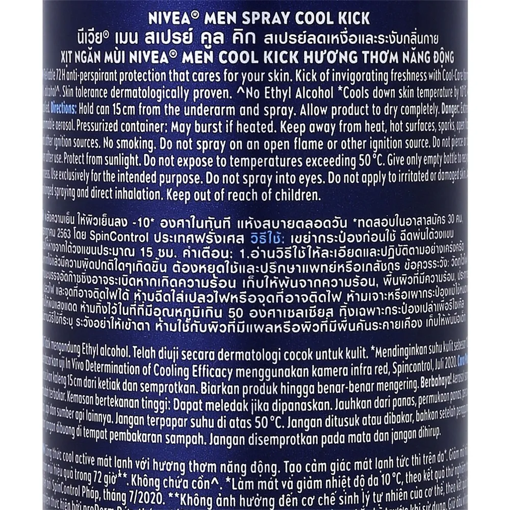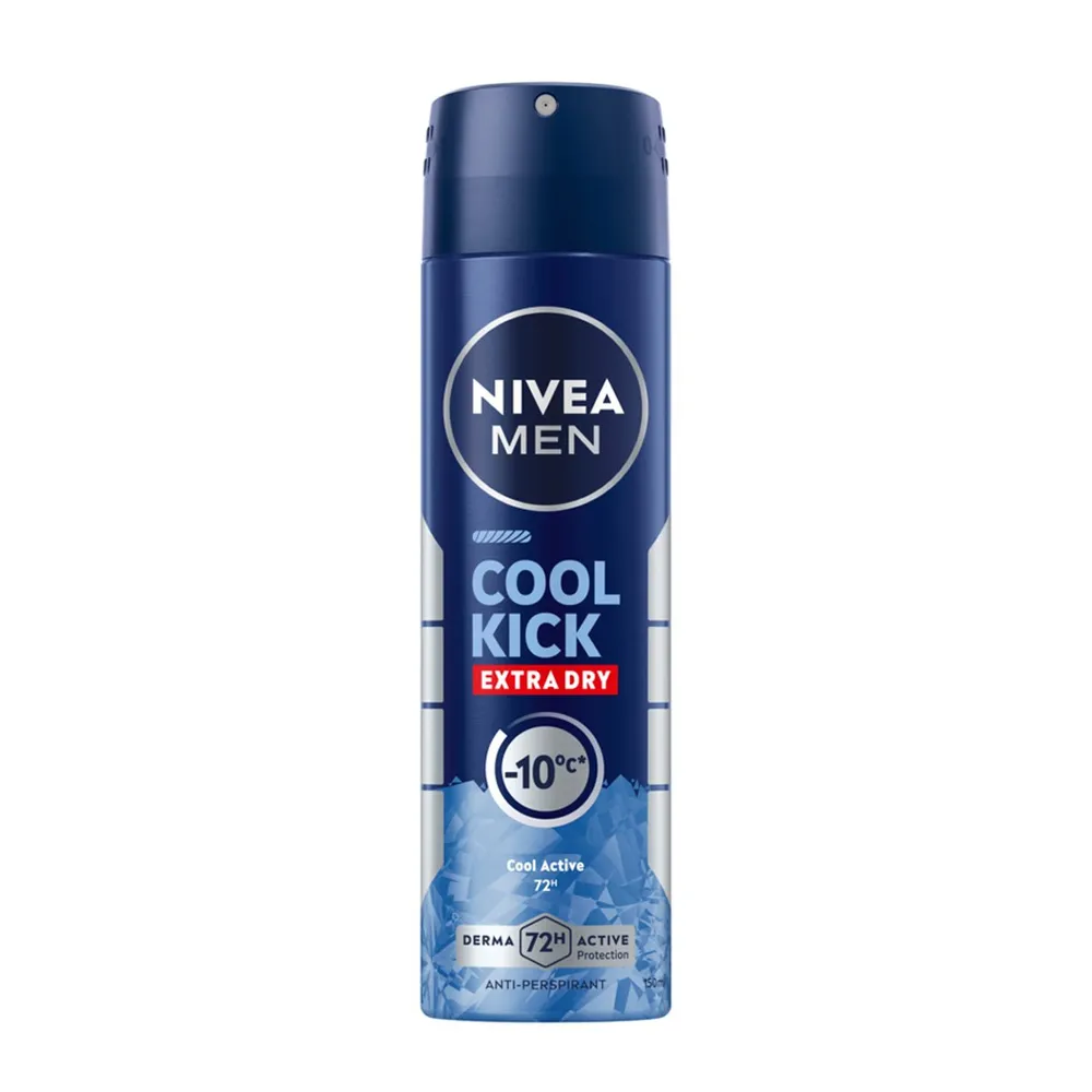 นีเวีย เมน คูล คิก สเปรย์ลดเหงื่อและระงับกลิ่นกาย สเปรย์ระงับกลิ่นกายสำหรับผู้ชาย สูตรเย็น แห้งสบาย ให้ผิวเย็นลง -10 องศาในทันที พร้อมลดเหงื่อได้ถึง 3 เท่า และปกป้องยาวนาน 48 ชม.<br />