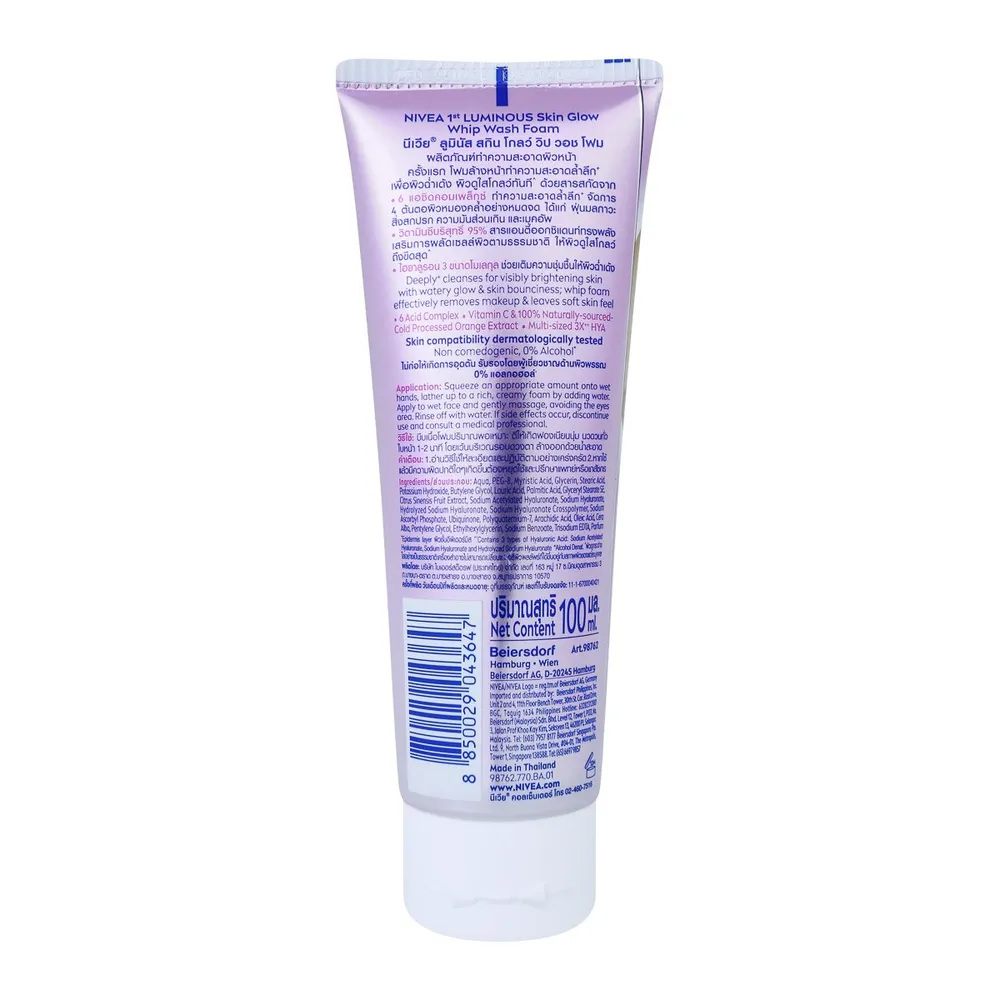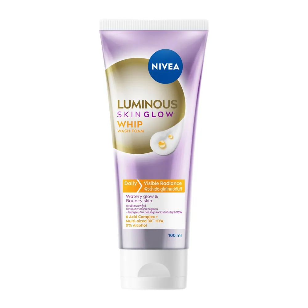 นีเวีย ลูมินัส สกิน โกลว์ วิป วอช โฟม ผลิตภัณฑ์ทำความสะอาดผิวหน้า ครั้งแรก โฟมล้างหน้าทำความสะอาดล้ำลึก+ เพื่อผิวฉ่ำเด้ง ผิวดูใสโกลว์ทันที^ ด้วยสารสกัดจาก 6 แอซิดคอมเพล็กซ์ ทำความสะอาดล้ำลึก+ จัดการ 4 ต้นตอผิวหมองคล้ำอย่างหมดจด ได้แก่ ฝุ่นมลภาวะ สิ่งสกปรก ความมันส่วนเกิน และเมคอัพ วิตามินซีบริสุทธิ์ 95% สารแอนตี้ออกซิแดนท์ทรงพลัง เสริมการผลัดเซลล์ผิวตามธรรมชาติ ให้ผิวดูใสโกลว์ถึงขีดสุด^<br />