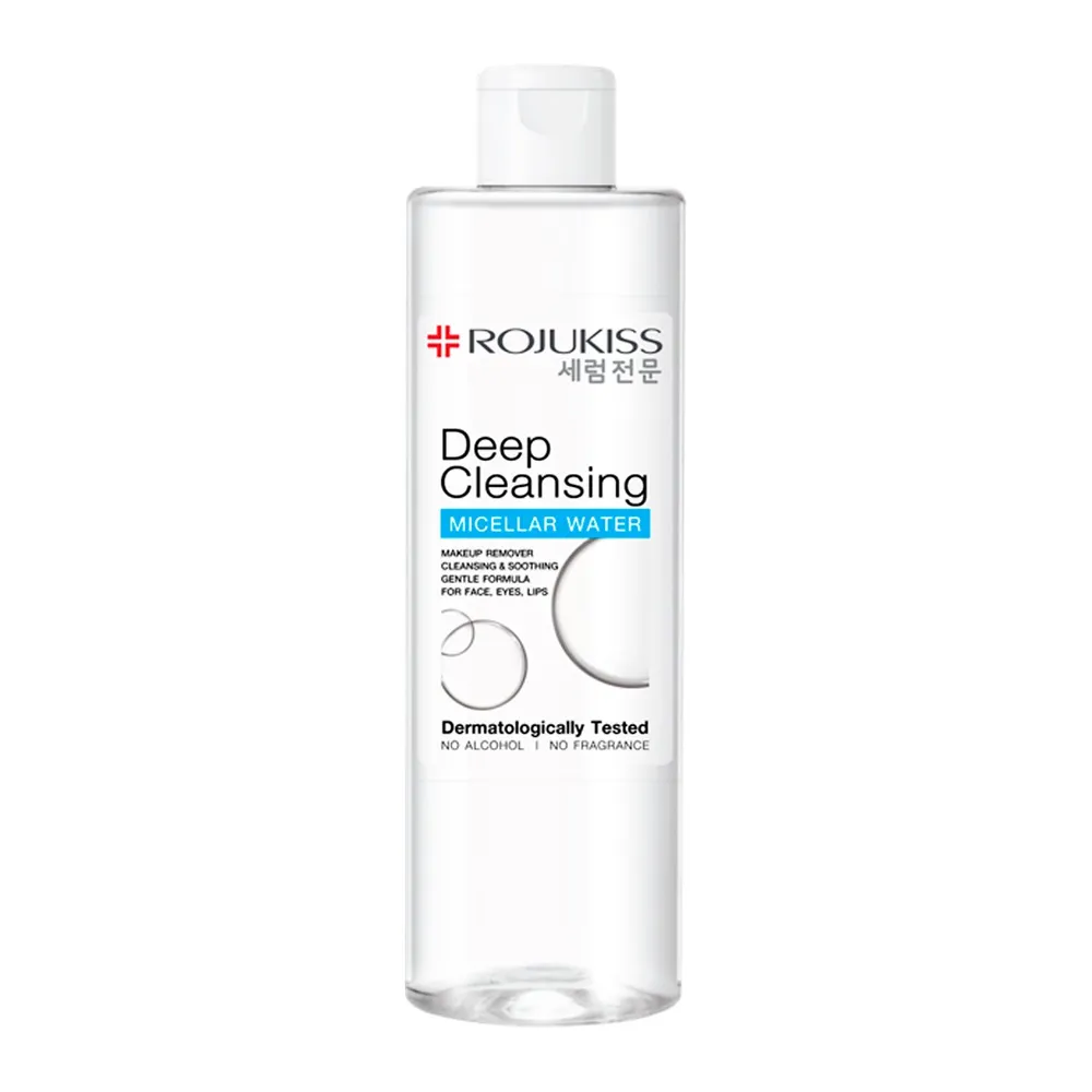 &quot;ROJUKISS&quot; Deep Cleansing Micellar Water เทคโนโลยี Tri-Cleansing Micellar ช่วยทำความสะอาดผิวอย่างล้ำลึก ลบเมคอัพหมดจด ล็อกความชุ่มชื้น เคลียร์สิ่งสกปรกอุดตันของรูขุมขน พร้อมบำรุงผิวสวย คืนผิวเด้งฟู กระจ่างใส ใช้ได้ทั่วใบหน้า บริเวณรอบดวงตาและริมฝีปาก มาพร้อมสารบำรุงผิวจัดเต็ม<br />