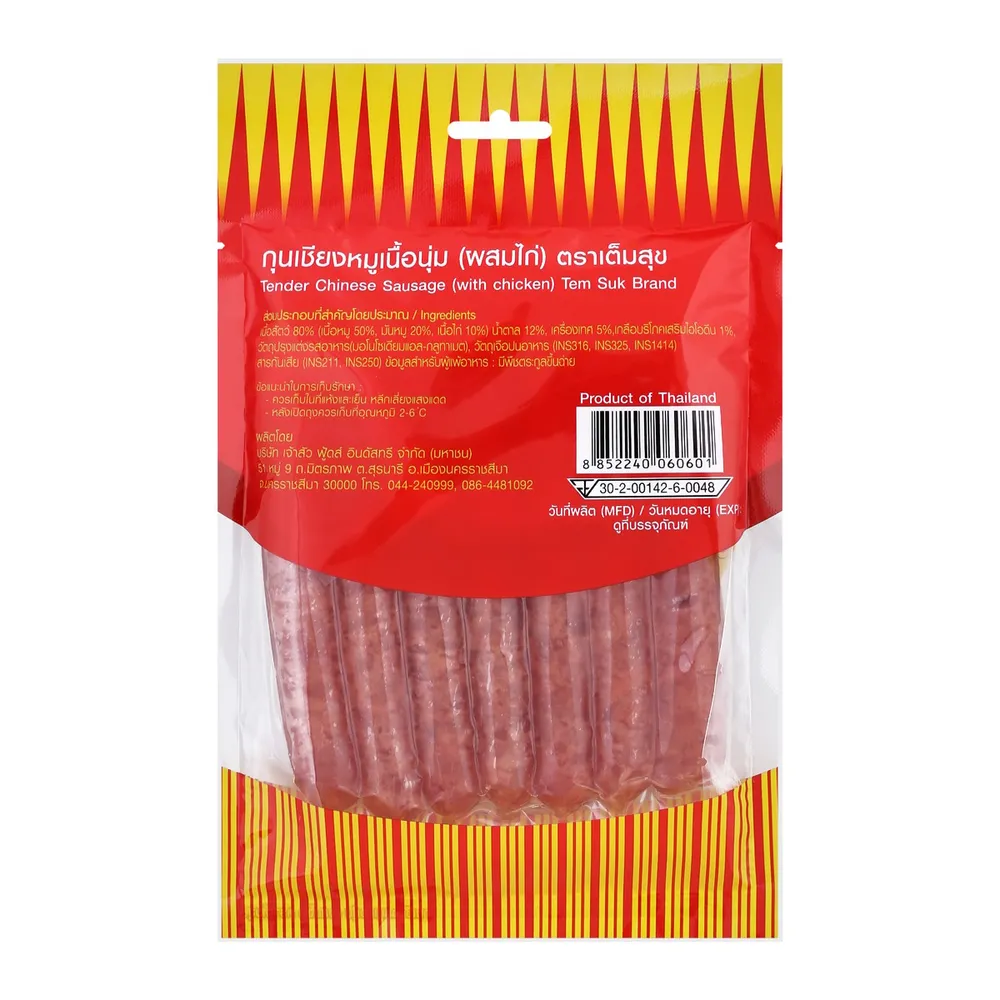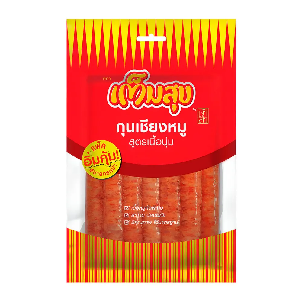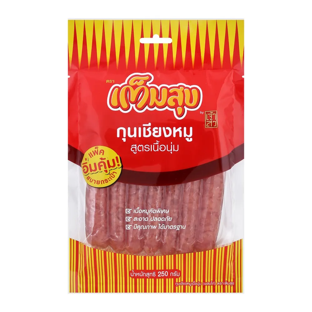 เจ้าสัว เต็มสุข กุนเชียงหมู สูตรเนื้อนุ่ม ที่ผลิตจากวัตถุดิบคุณภาพดี ผ่านกรรมวิธีที่ได้มาตรฐาน รสชาติอร่อย มีประโยชน์ สามารถรับประทานเป็นอาหารว่างได้ทุกที่ทุกเวลา และทุกโอกาส<br />
