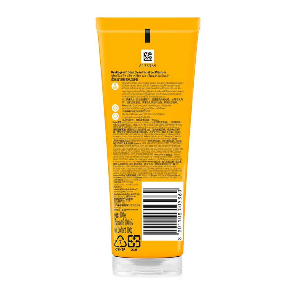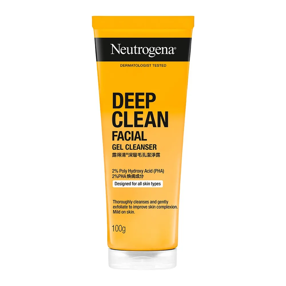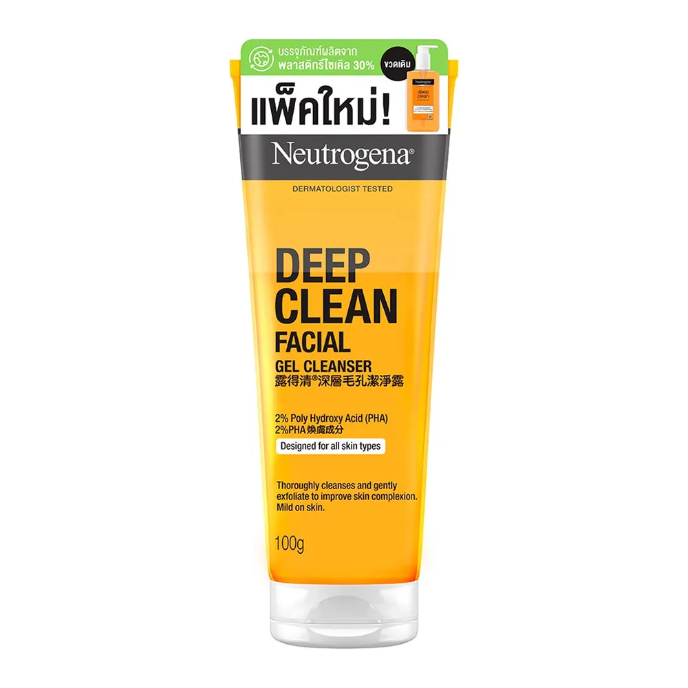 Neutrogena ดีพ คลีน เฟเชียล เจล คลีนเซอร์ เจลล้างหน้าสูตรอ่อนโยนปราศจากน้ำมัน พร้อมช่วยลดจุดด่างดำและรอยดำจากสิวอย่างเห็นได้ชัด เผยแลดูผิวกระจ่างใส สีผิวดูเรียบเนียนสม่ำเสมออย่างเป็นธรรมชาติด้วย Poly Hydroxy Acid (PHA)<br />