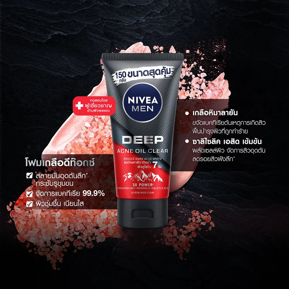นีเวีย เมน ดีพ แอคเน่ ออยล์ เคลียร์ สครับ มัด โฟม โฟมสครับล้างหน้าสำหรับผิวมันมาก เป็นสิวง่ายมาก มีรอยสิวลึก ครั้งแรกของการปรับสมดุลผิวเพื่อจัดการสิวเกิดซ้ำซาก ให้ผิวดูดีขึ้นใน 7 วัน พร้อมพลังดีท๊อกซ์ผิวจากสครับธรรมชาติจัดการสิ่งสกปรกและความมัน<br />