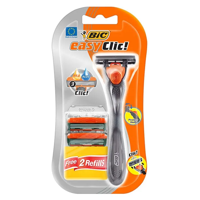 <p>บิค มีดโกน รุ่นอีซี่คลิก พร้อมรีฟิลใบมีด 2 ชิ้น<br /><br />บิค มีดโกน รุ่นอีซี่คลิก พร้อมรีฟิลใบมีด 2 ชิ้น ระบบ 3 ใบมีด หัวมีดโกนปรับหมุนได้ ไม่ระคายเคืองผิวด้วยสารสกัดจากว่านหางจระเข้และวิตามินอี<br /><br />- ระบบ 3 ใบมีด หัวมีดโกนสามารถปรับหมุนได้<br />- แถบยางเพิ่มการปกป้องผิวด้วยว่านหางจระเข้และวิตามินอี<br />- ด้ามจับยาว รูปทรงกระชับ จับถนัดมือ<br /><br />