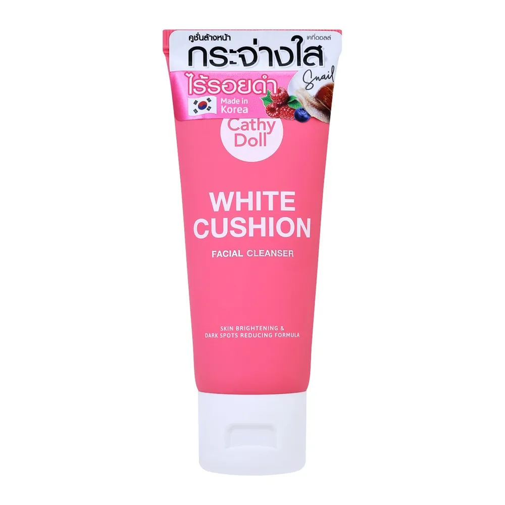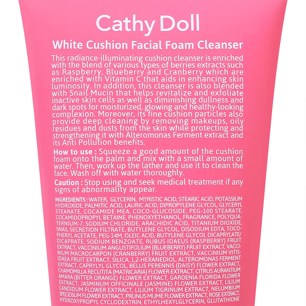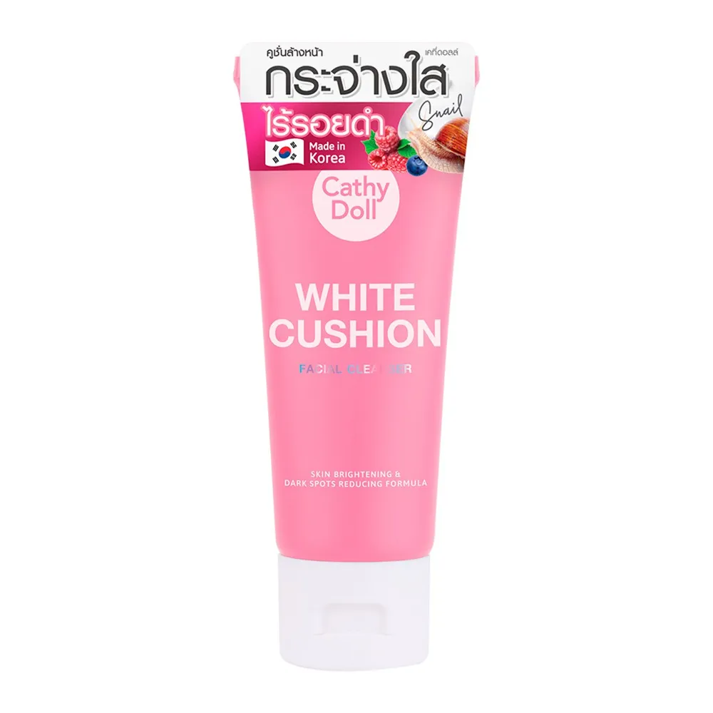 เคที่ ดอลล์ คูชั่นคลีนเซอร์สูตรผิวกระจ่างใสไร้รอยดำ ผสานสารสกัดจากผลไม้ตระกูลเบอร์รี่และเมือกหอยทาก ช่วยลดความหมองคล้ำ จุดด่างดำ และเพิ่มความกระจ่างใสให้ผิว<br />