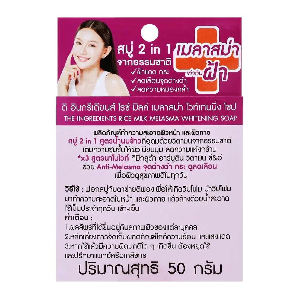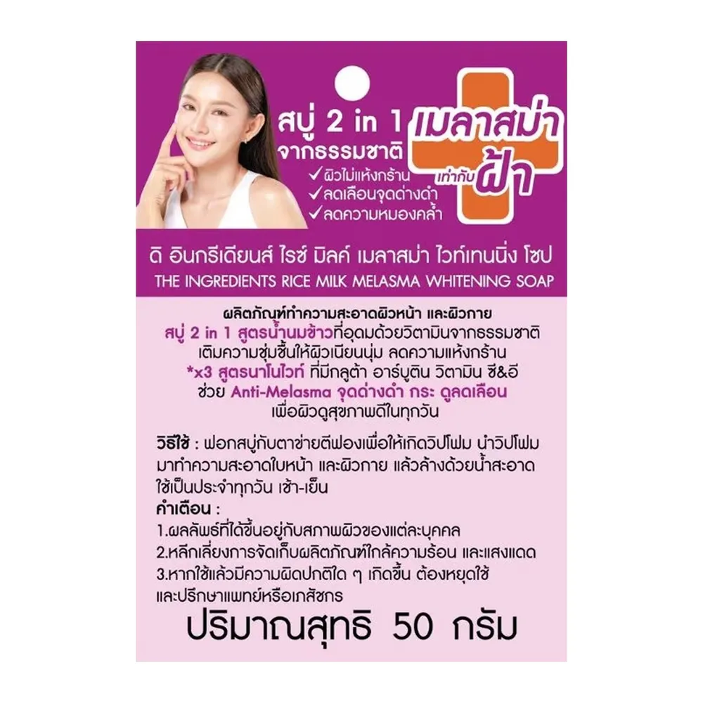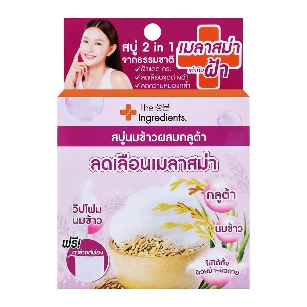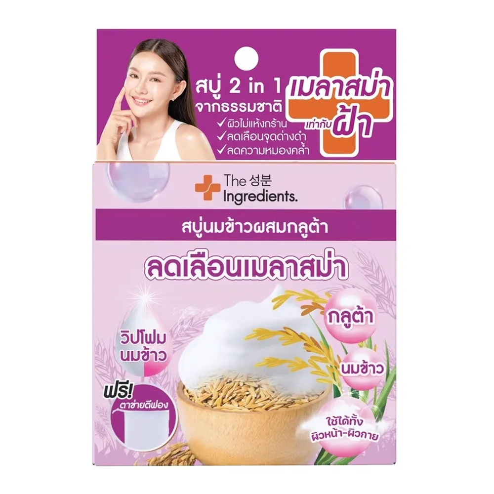 ดิ อินกรีเดียนส์ ไรซ์มิลค์ เมลาสม่า ไวท์เทนนิ่ง โซป ผลิตภัณฑ์ทำความสะอาดผิวหน้า และผิวกาย สบู่ 2in1 สูตรน้ำนมข้าวที่อุดมด้วยวิตามินจากธรรมชาติเติมความชุ่มชื้นให้ผิวเนียนนุ่ม ลดความแห้งกร้าน*x3<br />