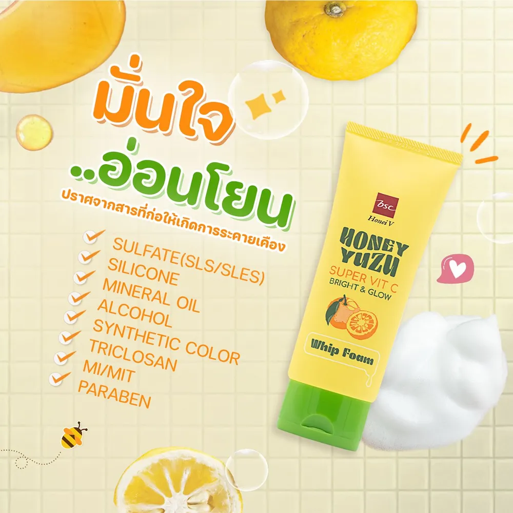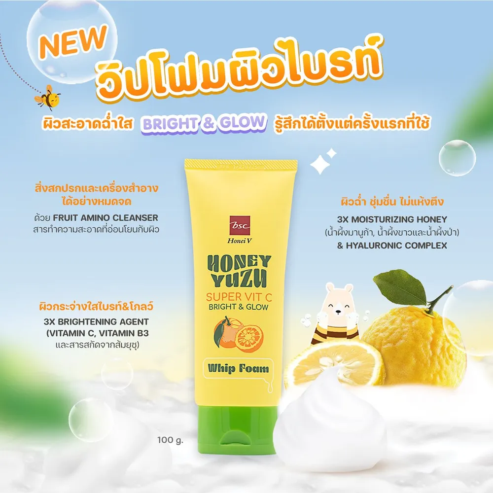 - ฮันนี่ วี บีเอสซี ฮันนี่ ยูซุ ซูเปอร์ วิตซี ไบรท์ แอนด์ โกลว์ วิป โฟม ผลิตภัณฑ์ทำความสะอาดผิวหน้า<br />