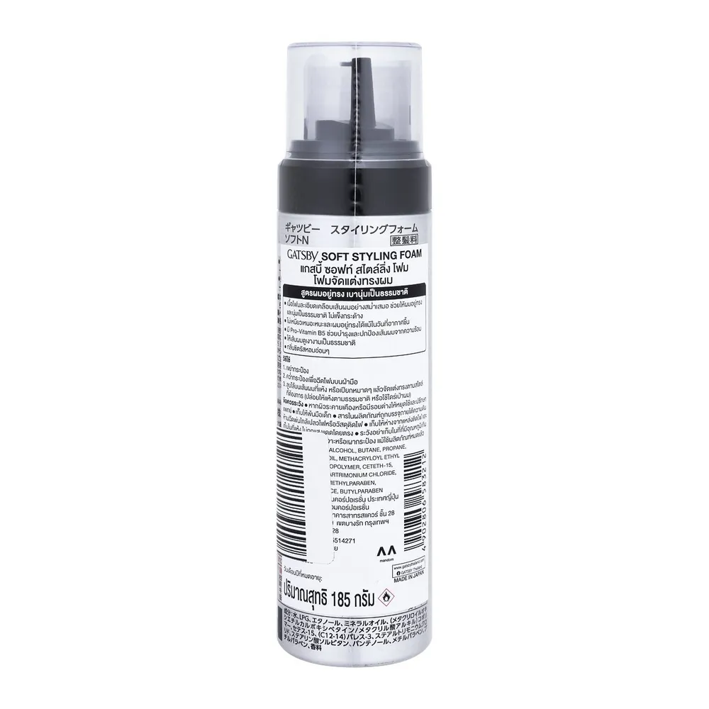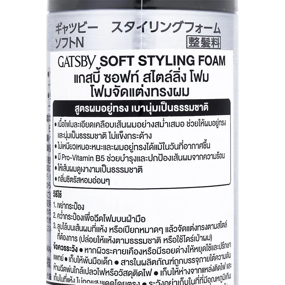 <p>แกสบี้ โฟมจัดแต่งทรงผม ซอฟท์ 185 ก.<br /><br />แกสบี้ โฟมจัดแต่งทรงผม ซอฟท์ ผมอยู่ทรงให้สัมผัสเป็นธรรมชาติ ช่วยเพิ่มวอลลุ่มให้เส้นผม บำรุงเส้นผมให้แข็งแรง ไม่แห้งเสีย จัดแต่งทรงได้ตามต้องการ<br /><br />- ให้ผมอยู่ทรงสัมผัสเป็นธรรมชาติ<br />- Vitamin B5 &amp; Moisturizer ให้ผมแข็งแรง<br />- Glycerin, mineral Oil, Ethyl Minkate ให้ผมชุ่มชื่น เพิ่มความเงางาม<br />- Benzophenone-2 ปกป้องความร้อนจากไดร์เป่าผม และรังสียูวี<br />- เหมาะสำหรับผมลีบตรง ผมลอน และผมแห้งชี้ฟู<br /><br />*ภาพประกอบใช้เพื่อการโฆษณาเท่านั้น</p>