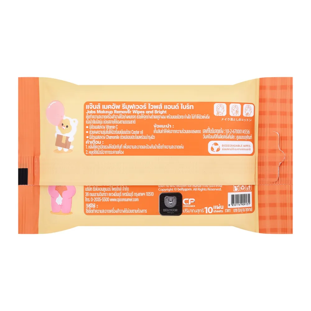 <p>แจ๊บส์ ผ้าเช็ดเครื่องสำอาง กระจ่างใส 10 แผ่น<br /><br />แจ๊บส์ ผ้าเช็ดเครื่องสำอาง ทำความสะอาดเครื่องสำอาง ได้อย่างหมดจด โดยไม่ทิ้งสารตกค้าง และ ความมันส่วนเกิน เผยผิวกระจ่างใส ริ้วรอยแลดูจางลง ด้วยส่วนผสมของ Vitamin C ช่วยผลัดเซลผิว กระชับรูขุมขน สร้างเกราะป้องกันผิว ด้วย Niacinamide (Vit B3)<br /><br />- Caster Oil ช่วย คงความชุ่มชื่น ให้ผิวเรียบเนียน ไม่แห้งตึง<br />- Caprylic มอยส์เจอร์ไรเซอร์เข้มข้น สกัดจากธรรมชาติ มีคุณสมบัติที่ช่วยให้ผิวนุ่มชุ่มชื่น ไม่เหนียวเหนอะหนะ ซึมเข้าสู่ผิวได้อย่างรวดเร็ว<br />- สารสกัดจาก คาโมมายล์ ช่วยปลอบประโลมผิว และบำรุงผิวที่แห้งกร้านให้กลับมานุ่มชุ่มชื่น พร้อมกลิ่นหอมผ่อนคลาย<br />- เลขที่ใบจดแจ้ง 10-2-6700014556<br /><br />