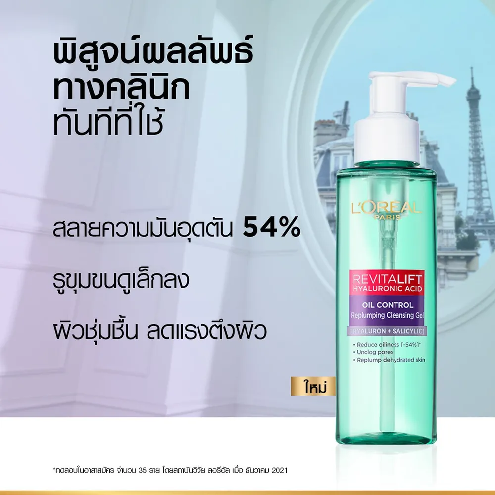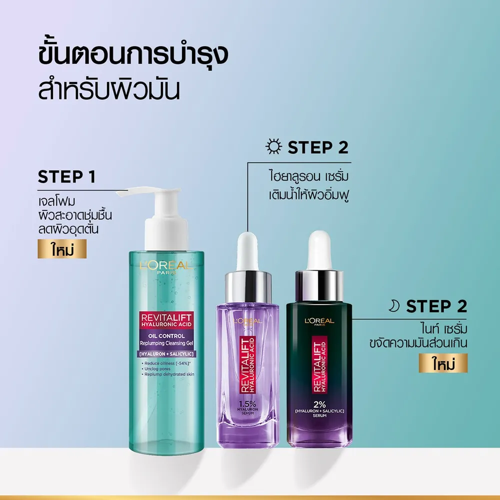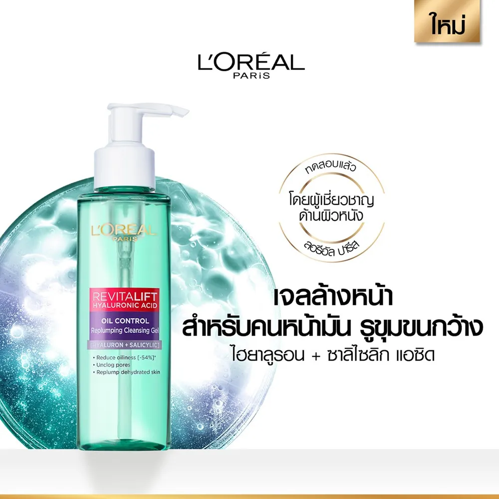 สถาบันวิจัยลอรีอัล ปารีส พัฒนา รีไวทัลลิฟท์ ไฮยาลูรอนิค แอซิด ออยล์ คอนโทรล รีพลัมปิง คลีนซิ่ง เจล ผลิตภัณฑ์ทำความสะอาดผิวหน้า ผสานด้วยซาลิไซลิก แอซิด และไฮยาลูรอนิค แอซิด++เข้มข้น ช่วยให้ผิวชุ่มชื้นอย่างล้ำลึก^และลดความมันส่วนเกินบนใบหน้าพร้อมทำความสะอาดผิวได้ดูหมดจด ลดสิ่งอุดตัดและช่วยให้รูขุมขน^^ดูเล็กลงโดยไม่ทำให้ผิวแห้งกร้าน<br />