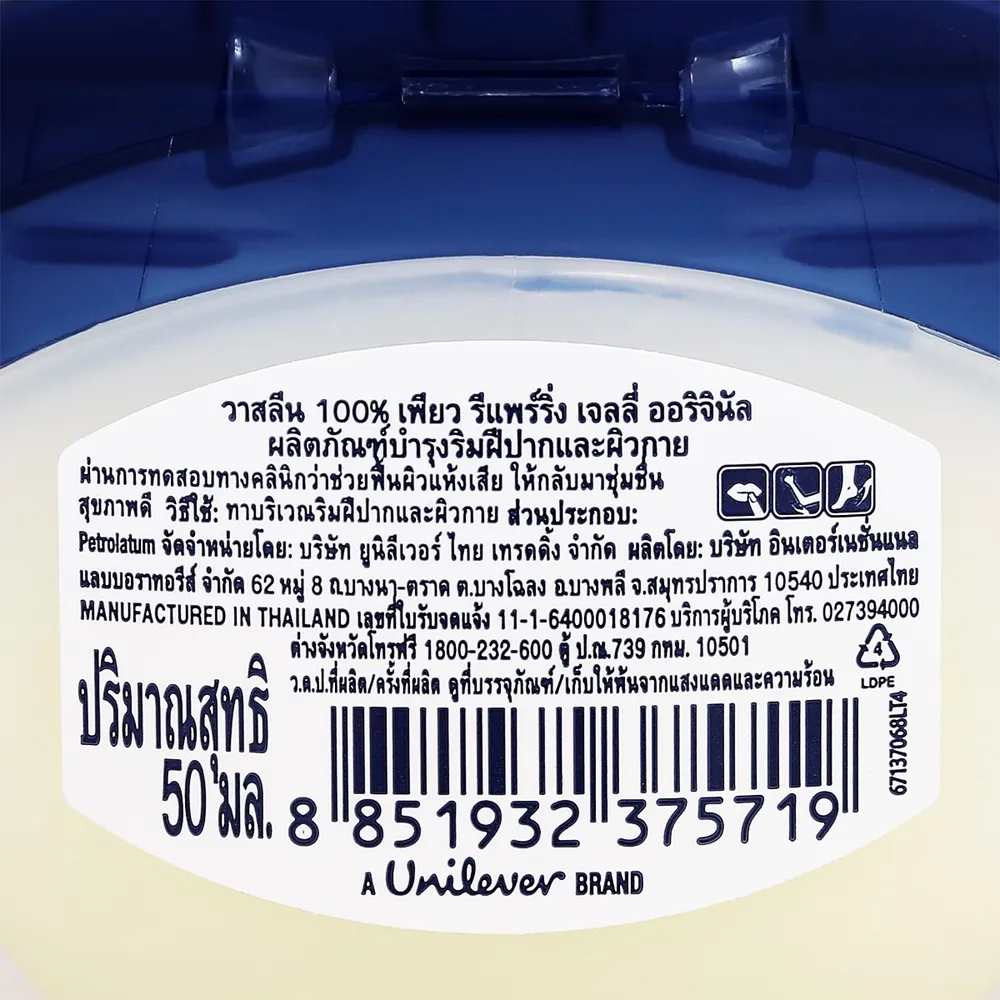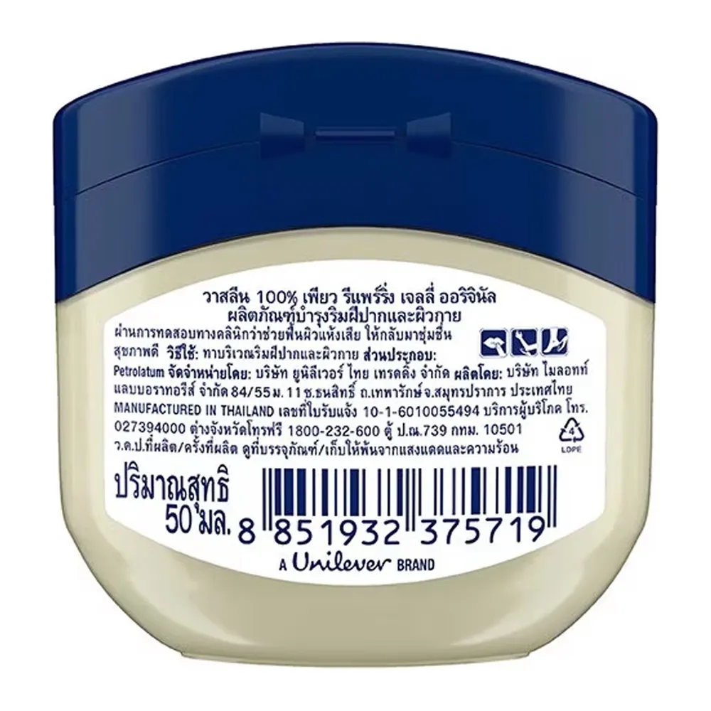 <p>วาสลีน ผลิตภัณฑ์บำรุงทาริมฝีปากและผิวกาย 100% เพียว รีแพร์ริ่ง เจลลี่ ออริจินัล 50 มล.<br />