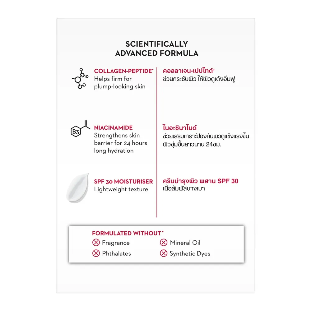 -&nbsp;คอลลาเจน เปปไทด์ + Niacinamide (วิตามิน B3) ช่วยบำรุงผิวอย่างล้ำลึก เติมความชุ่มชื้นยาวนาน 24 ชั่วโมง<br />
