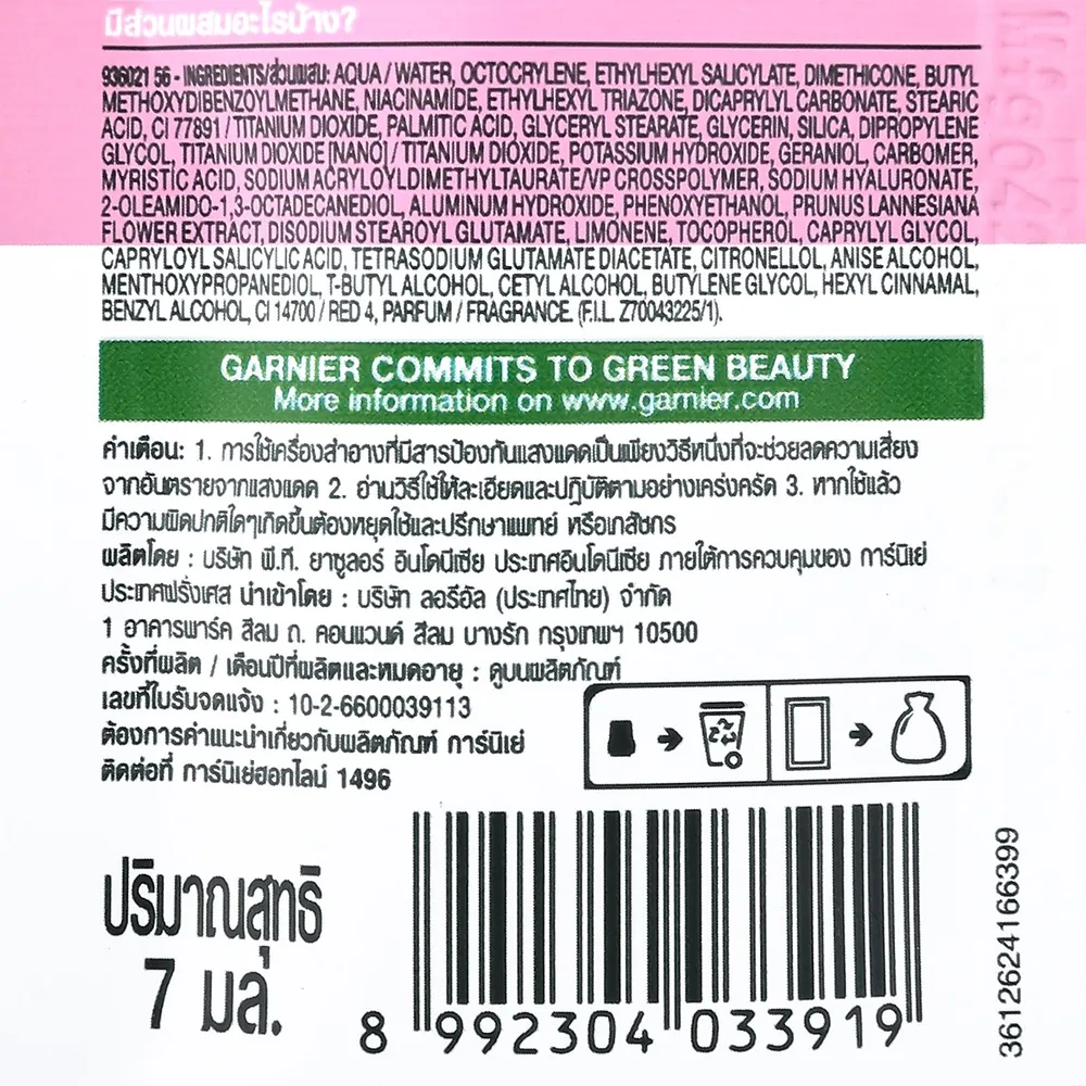 การ์นิเย่ ซากุระ ไวท์ พิงค์คิช โกลว์ เซรั่ม ครีม เอสพีเอฟ 30 พีเอ+++ แบบซอง 7 มล.