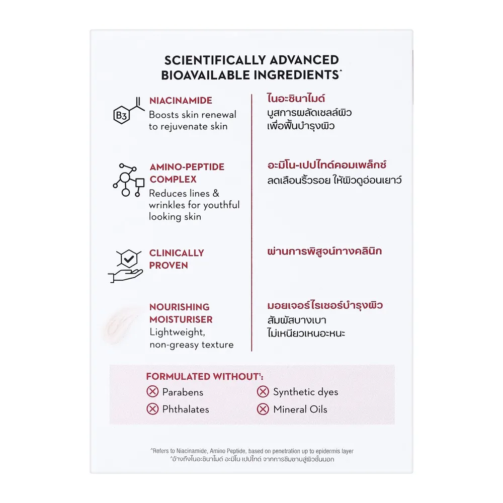 - สูตรผสานอะมิโน-เปปไทด์ คอมเพล็กซ์ และไนอะซินาไมด์ ที่ช่วยมอบความชุ่มชื้นลงลึกให้ 10 ชั้นเพื่อช่วยสร้างเซลล์ผิวชั้นนอกใหม่<br />