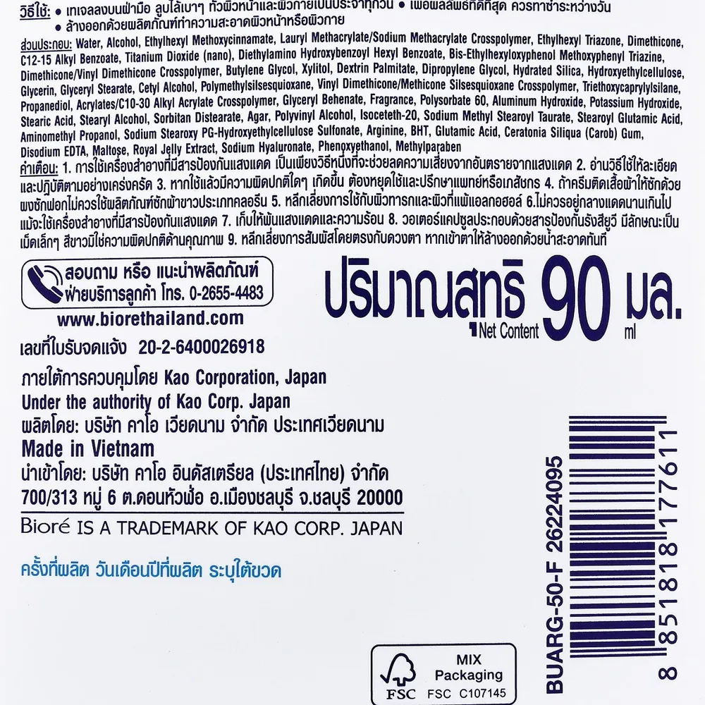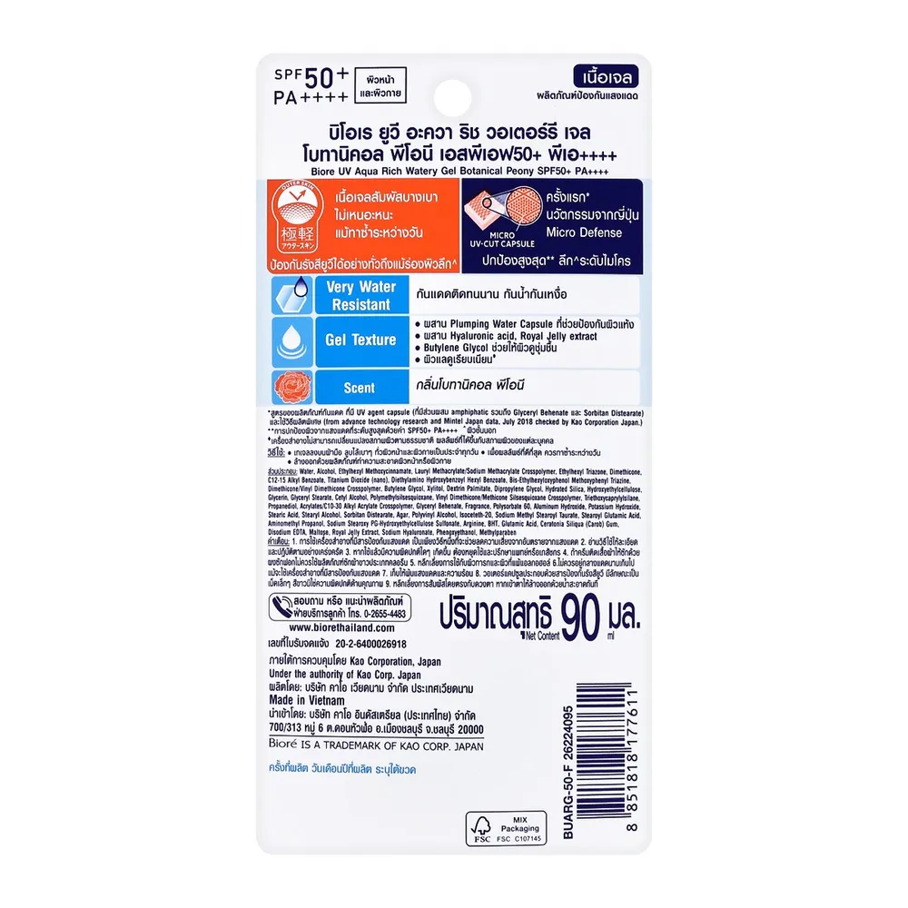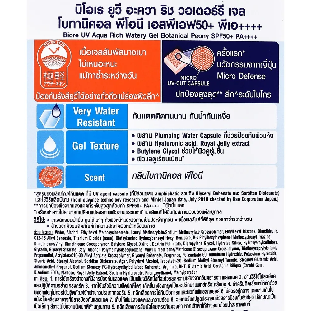 - บิโอเร ยูวี โบทานิคัล พีโอนี เจลกันแดดบำรุงผิว สูตรน้ำ เอสพีเอฟ 50+ พีเอ++++<br />