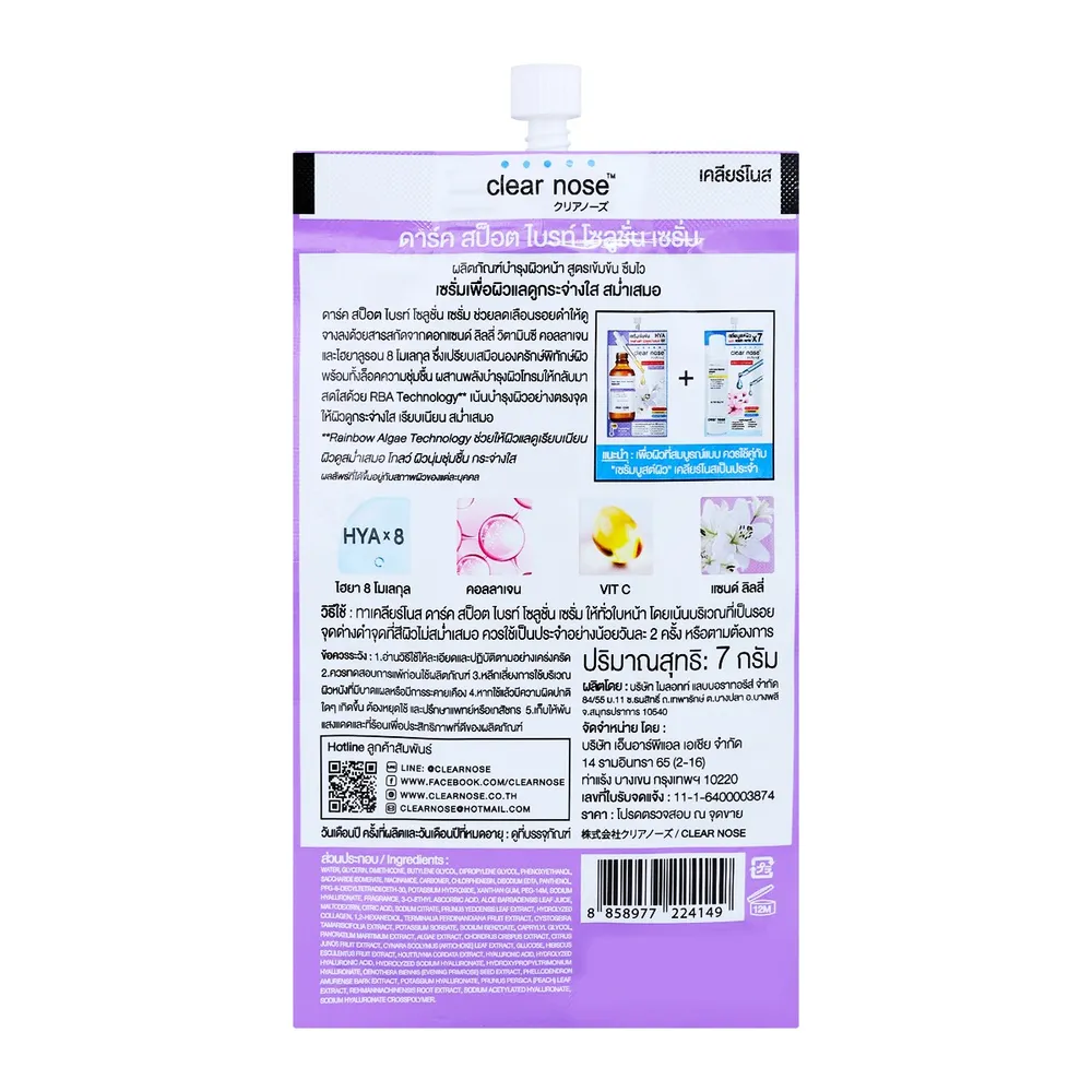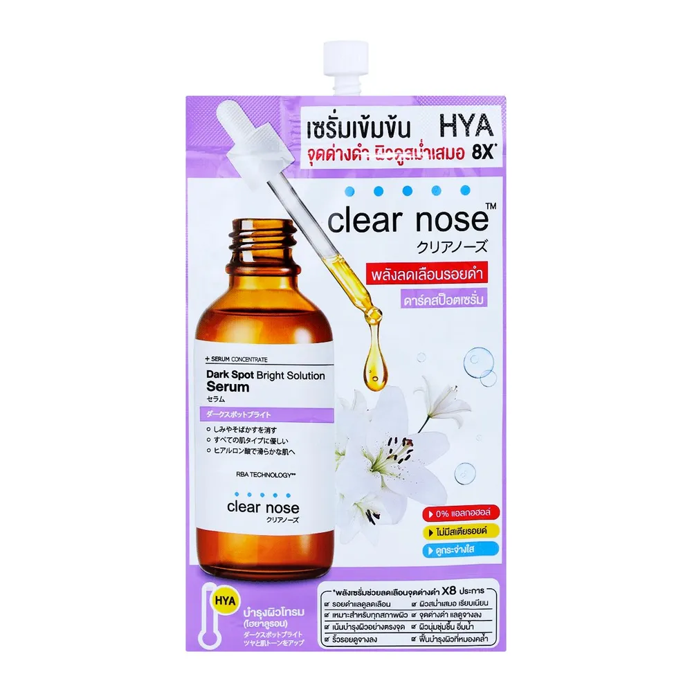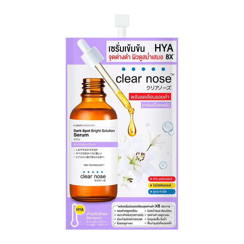 เคลียร์โนส&nbsp; ดาร์ค สป็อต ไบรท์ โซลูชั่น เซรั่ม ช่วยลดเลือนรอยดำให้ดูจางลงด้วยสารสกัดจากดอกแซนด์ ลิลลี่ วิตามินซี คอลลาเจน และไฮยาลูรอน 8 โมเลกุล ซึ่งเปรียบเสมือนองครักษ์พิทักษ์ผิวพร้อมทั้งล็อคความชุ่มชื้น ผสานพลังบำรุงผิวโทรมให้กลับมาสดใสด้วย RBA Technology** เน้นบำรุงผิวอย่างตรงจุด ให้ผิวดูกระจ่างใส เรียบเนียน สม่ำเสมอ **Rainbow Algae Technology ช่วยให้ผิวแลดูเรียบเนียน ผิวดูสม่ำเสมอ โกลว์ ผิวนุ่มชุ่มชื้น กระจ่างใส<br />