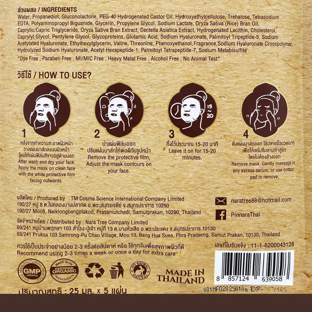 มาส์กบำรุงผิวหน้าที่อุดมไปด้วยไปด้วยคุณค่าของสารสกัดจาก ข้าวหอมมะลิไทย ข้าวญี่ปุ่นที่ปลูกด้วยกระบวนการออร์แกนิก น้ำมันรำข้าว และสารสกัดจากใบบัวบกที่อุดมไปด้วยโปรตีน แร่ธาตุและวิตามินจากธรรมชาติ ผสานกับนวัตกรรม 4D Hyaluronic Acid หรือ ไฮยาลูรอนคุณภาพสูงที่สามารถซึมซาบเข้าสู่ทุกชั้นผิว<br />