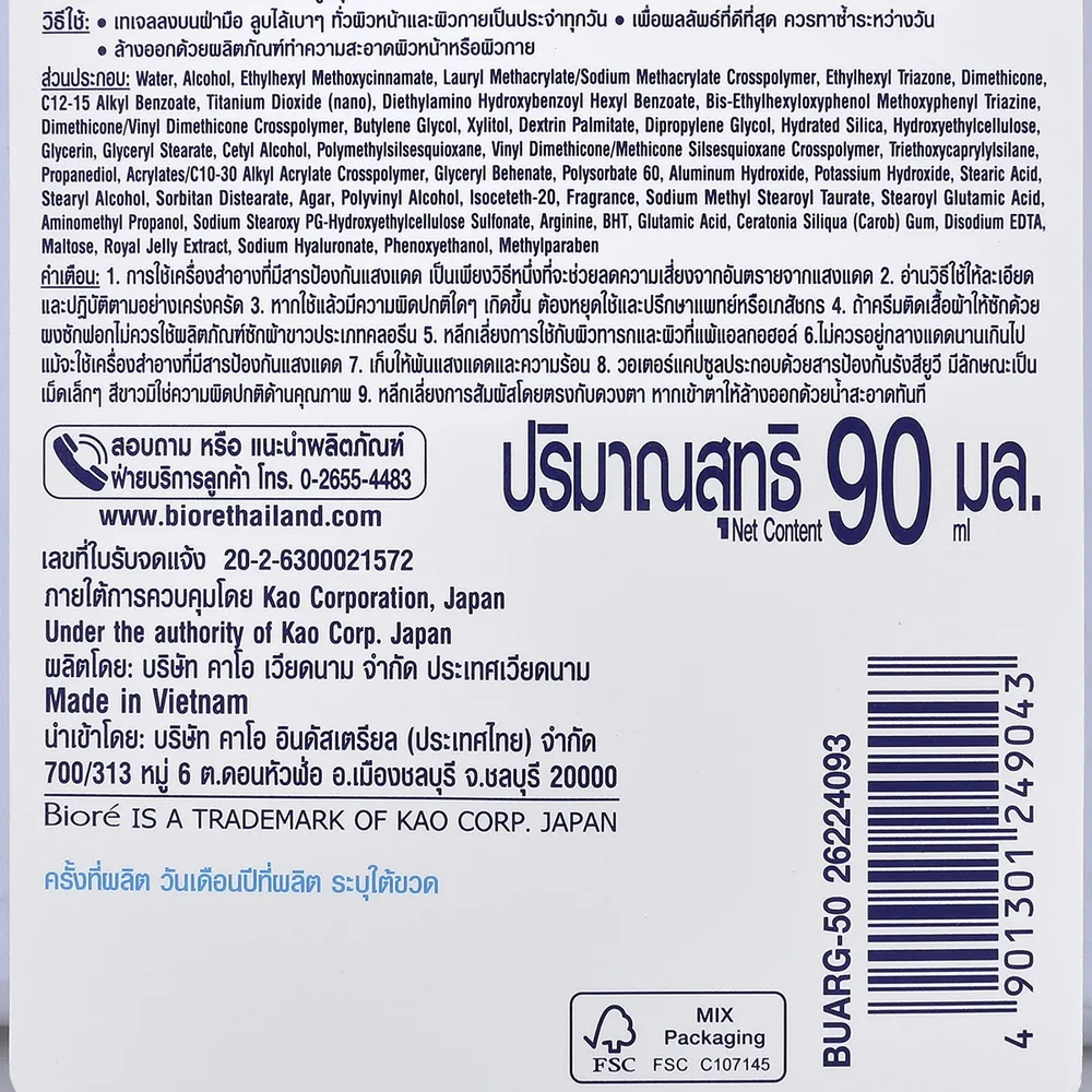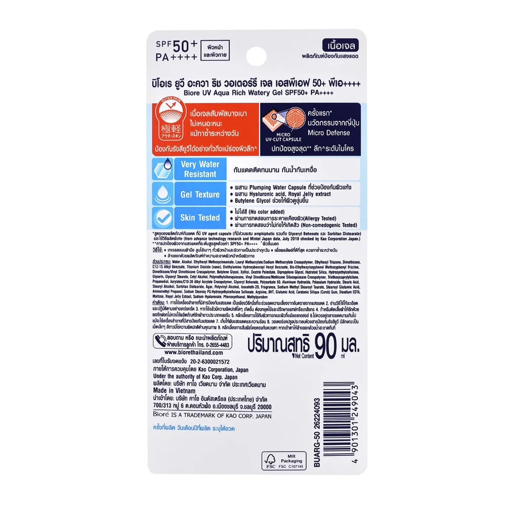 - บิโอเร ยูวี อะควา ริช วอเตอร์รี เจล ครีมกันแดด SPF50+ PA++++<br />