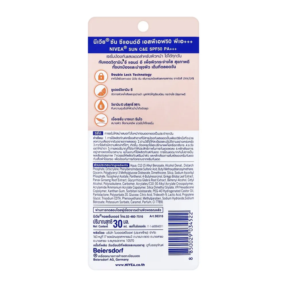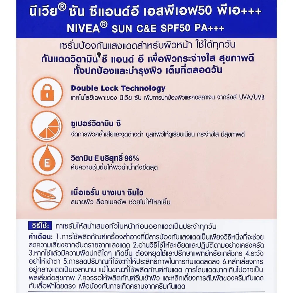 นีเวีย ซัน ซีแอนด์อี เอสพีเอฟ 50 พีเอ+++ เซรั่มป้องกันแสงแดดสำหรับผิวหน้า กันแดดวิตามินซีและอี สูตรเร่งผิวใส ไม่กลัวแดดด้วย Double Lock Technology เพิ่มการปกป้องผิวและคอลลาเจนจากรังสี UVA/UVB ซูเปอร์วิตามินซีจัดการผิวคล้ำเสียและจุดด่างดำ บูสท์ผิวให้ดูเรียบเนียน วิตามิน E บริสุทธิ์ 96% คืนความชุ่มชื่น ให้ผิวฉ่ำน้ำถึงขีดสุด เนื้อเซรั่มบางเบา ซึมไว สบายผิว ช่วยล็อกเมคอัพไม่ให้ไหลเยิ้ม<br />