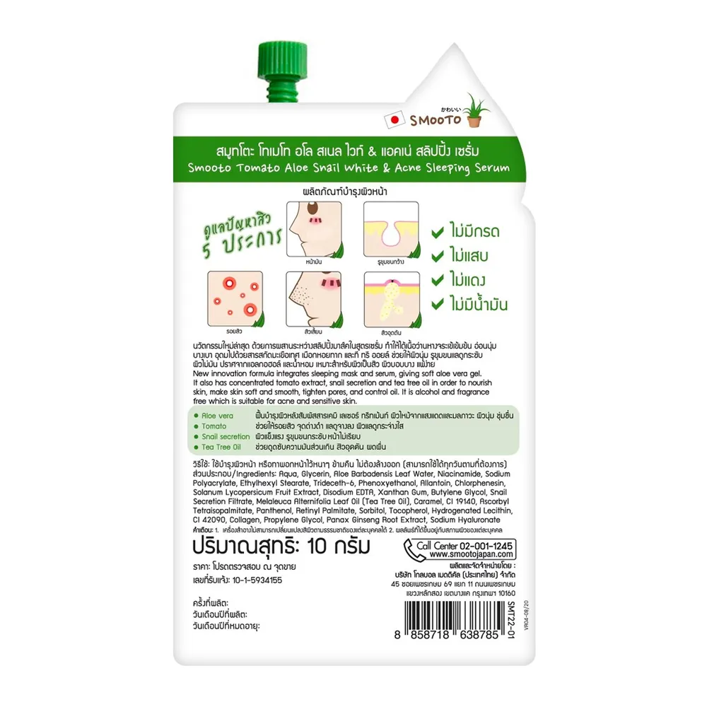 สมูทโตะ สลิปปิ้ง เซรั่ม นวัตกรรมใหม่ที่ผสานระหว่างสลิปปิ้งมาส์ค และเซรั่มที่จะได้จากเนื้อว่านหางจระเข้ เนื้อเซรั่มเข้มข้นอ่อนนุ่ม บางเบา อุดมไปด้วยสารสกัดมะเขือเทศ เมือกหอยทาก และทีทรีออยล์ ช่วยให้ผิวนุ่ม รูขุมขนแลดูกระชับ ผิวไม่มัน ปราศจากแอลกอฮอล์ และน้ำหอม<br />