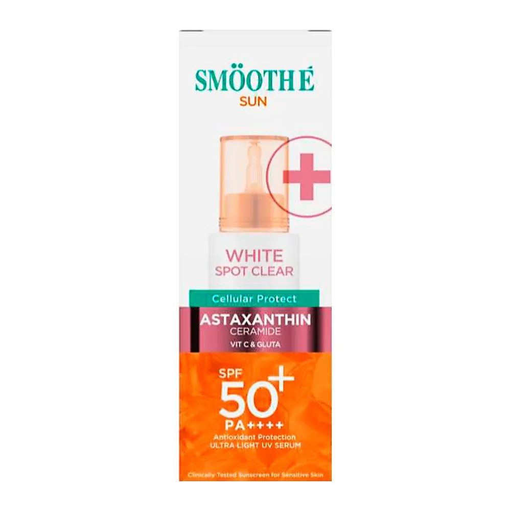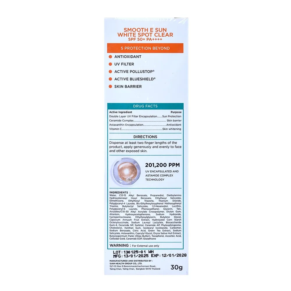 สมูทอี Sun White spot clear : Astaxanthin &amp; ceramide Vit C &amp; Glutathione (สูตรสีแดง : กันแดด + ผิวใส) HYBRID SUN SCREEN PROTECT YOUR CELL FOR BABY SKIN คุณสมบัติโดยรวม 4 Protection Beyond มี 5 เกราะป้องกันผิว<br />