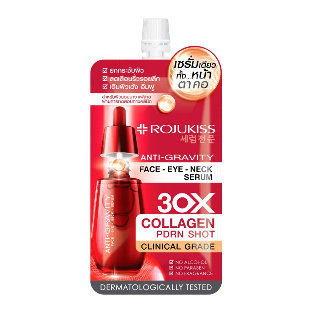 นวัตกรรมใหม่ล่าสุดจากโรจูคิส เซรั่มช็อตเข้มข้นฟื้นฟูผิวเร่งด่วน ยกกระชับกรอบหน้า ตึงทั้งหน้า รอบดวงตา และลำคอ PDRN ส่วนผสมทรงพลังจากแรงบันดาลใจ PDRN ที่ใช้ฉีดฟื้นฟูผิวเร่งด่วนในคลินิกความงาม COLLAGEN 30 เท่า เสริมความยืดหยุ่นผิว ลดเลือนสัญญาณความร่วงโรยของผิว เติมความชุ่มชื้นให้ผิวดูอิ่มน้ำ ไม่แห้งกร้าน ให้ผิวดูอ่อนเยาว์สุขภาพดี<br />