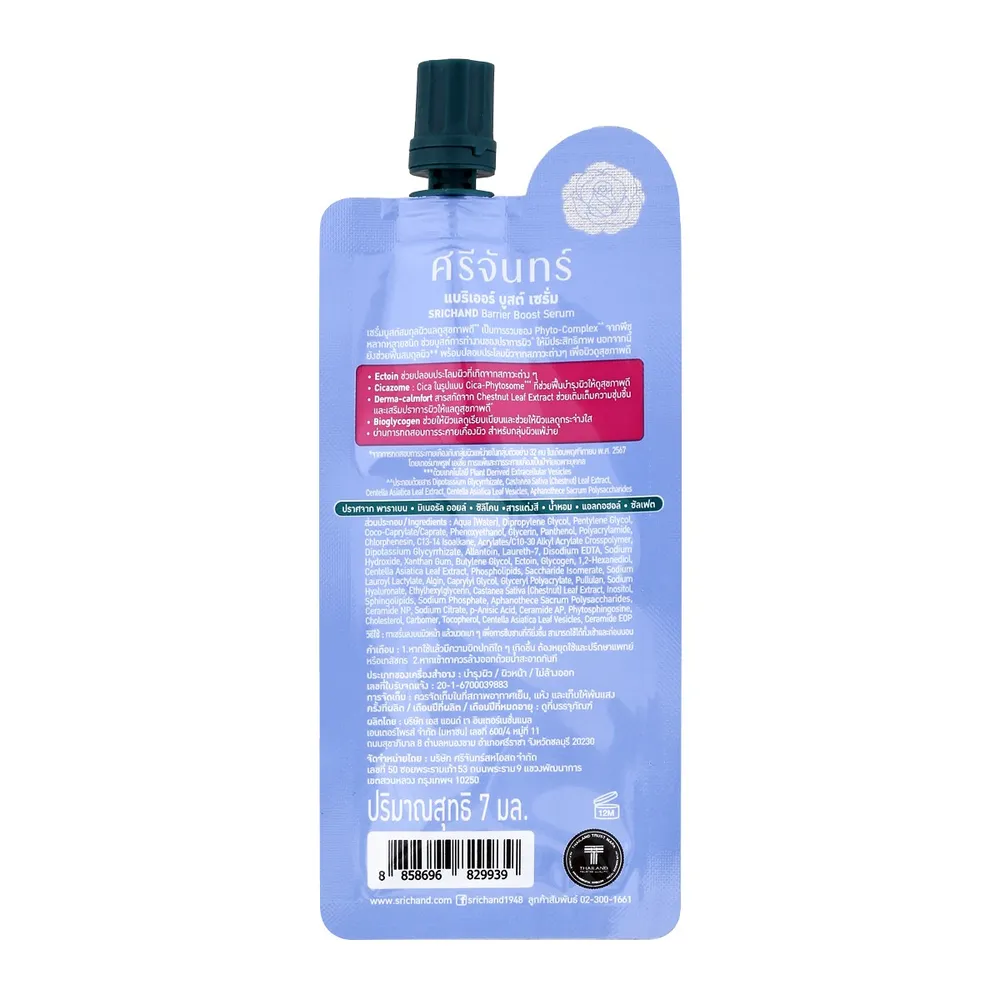 <p>ศรีจันทร์ แบริเออร์ บูสต์ เซรั่ม<br /> <br /> เซรั่มบูสต์สมดุลผิวแลดูสุขภาพดี** เป็นการรวมของPhyto-Complex^^ จากพืชหลากหลายชนิด ช่วยบูสต์การทำงานของปราการผิว^ ให้มีประสิทธิภาพ นอกจากนี้ยังช่วยฟื้นสมดุลผิว** พร้อมปลอบประโลมผิวจากสภาวะต่างๆ เพื่อผิวดูสุขภาพดี<br /> <br /> - Ectoin ช่วยปลอบประโลมผิวจากสภาวะต่าง ๆ<br /> - Cicazome : Cica ในรูปแบบ Cica-Phytosome^^ ที่ช่วยบำรุงผิวให้ดูสุขภาพดี<br /> - Derma-calmfort สารสกัดจาก Chestnut Leaf Extract ช่วยเติมความชุ่มชื้นและเสริมปราการผิวแลดูสุขภาพดี^<br /> - Bioglycogen ช่วยให้ผิวแลดูเรียบเนียนและช่วยให้ผิวแลดูกระจ่างใส<br /> - ผ่านการทดสอบการระคายเคืองผิวสำหรับกลุ่มผิวแพ้ง่าย*<br /> - ปราศจากพาราเบน, มิเนอรัล ออยล์, ซิลิโคน, สารแต่งสี, น้ำหอม, แอลกอฮอล์***, ซัลเฟต<br /> <br /> *จากการทดสอบการระคายเคืองกับกลุ่มผิวแพ้ง่ายในกลุ่มตัวอย่าง 32 คน ในเดือนพฤศจิกายน พ.ศ. 2567 โดยเดอร์มาพรูฟ เอเชีย การแพ้และการระคายเคืองเป็นปัจจัยเฉพาะบุคคล<br /> ** ฟื้นสมดุลผิวจากความแห้งกร้าน ***ด้วยเทคโนโลยี Plant Derived Extracellular Vesicles<br /> ^^ ประกอบด้วยสาร Dipotassium Glycyrrhizate, Castanea Sativa (Chestnut) Leaf Extract , Centella Asiatica Leaf Extract, Centella Asiatica Leaf Vesicles, Aphanothece Sacrum Polysaccharides<br /> <br /> <span style="font-weight: bold;">วิธีใช้:</span> ทาเซรั่มลงบนผิวหน้า แล้วนวดเบา ๆ เพื่อการซึมซาบที่ดียิ่งขึ้น สามารถใช้ได้ทั้งเช้าและก่อนนอน<br /> <br /> <span style="font-weight: bold;">ส่วนผสม:</span><br /> Aqua (Water), Dipropylene Glycol, Pentylene Glycol, Coco-Caprylate/Caprate, Phenoxyethanol, Glycerin, Panthenol, Polyacrylamide, Chlorphenesin, C13-14 Isoalkane, Acrylates/C10-30 Alkyl Acrylate Crosspolymer, Dipotassium Glycyrrhizate, Allantoin, Sodium Hydroxide, Laureth-7, Disodium EDTA, Butylene Glycol, Ectoin, Glycogen, 1,2-Hexanediol, Centella Asiatica Leaf Extract, Phospholipids, Saccharide Isomerate, Sodium Lauroyl Lactylate, Algin, Caprylyl Glycol, Glyceryl Polyacrylate, Pullulan, Sodium Hyaluronate, Ethylhexylglycerin, Castanea Sativa (Chestnut) Leaf Extract, Inositol, Sphingolipids, Sodium Phosphate, Aphanothece Sacrum Polysaccharides, Ceramide NP, Sodium Citrate, p-Anisic Acid, Ceramide AP, Phytosphingosine, Cholesterol, Xanthan Gum, Carbomer, Tocopherol, Centella Asiatica Leaf Vesicles, Ceramide EOP<br /> <br /> <img alt="" src="https://st.bigc-cs.com/public/static/media/uploads/2025/09/srichand-barrier-boost-01-jpg" width="500" /><br /> <img alt="" src="https://st.bigc-cs.com/public/static/media/uploads/2025/09/srichand-barrier-boost-02-jpg" width="500" /><br /> <img alt="" src="https://st.bigc-cs.com/public/static/media/uploads/2025/09/srichand-barrier-boost-03-jpg" width="500" /><br /> <br /> <span style="color: #ff0000;">*บริษัทฯ ขอสงวนสิทธิ์ในการปรับเปลี่ยนราคาจำหน่ายและโปรโมชั่น รวมถึงแพ็คเกจและปริมาณสินค้าจากผู้ผลิตได้ตามความเหมาะสม โดยไม่จำเป็นต้องแจ้งให้ทราบล่วงหน้า</span><br /> <br /> *สีของสินค้าอาจมีความแตกต่าง ขึ้นอยู่กับการตั้งค่าของแต่ละหน้าจอ และภาพประกอบใช้เพื่อการโฆษณาเท่านั้น</p>