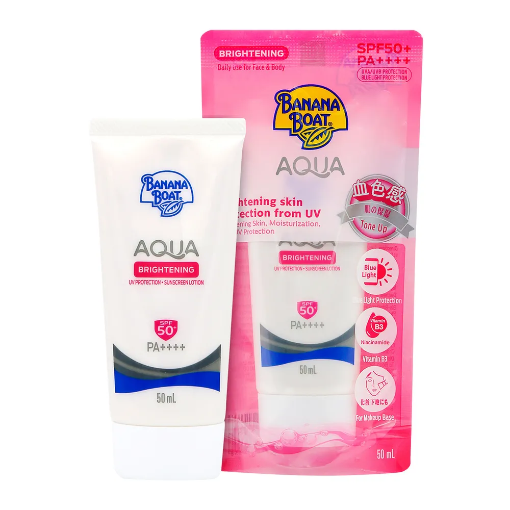 <p>บานาน่า โบ๊ท อควาไบรท์เทนนิ่ง ยูวี โพรเทคชั่น SPF50+ PA++++ 50 มล.<br />