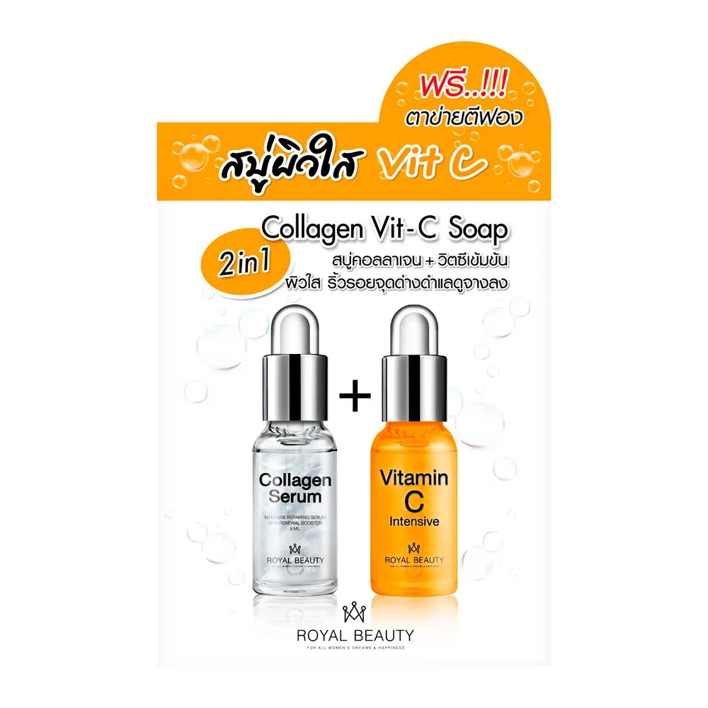 สบู่คอลลาเจนเซรั่ม +วิตซีเข้มข้นจากแบรนด์ รอยัลบิวตี้ ผิวหน้าใส ริ้วรอยและจุดด่างดำแลดูจางลง สบู่เพื่อผิวกระจ่างใส สูตรวิตามินซีเข้มข้น ช่วยลดความหมองคล้ำจุดด่างดำแลดูจางลง<br />