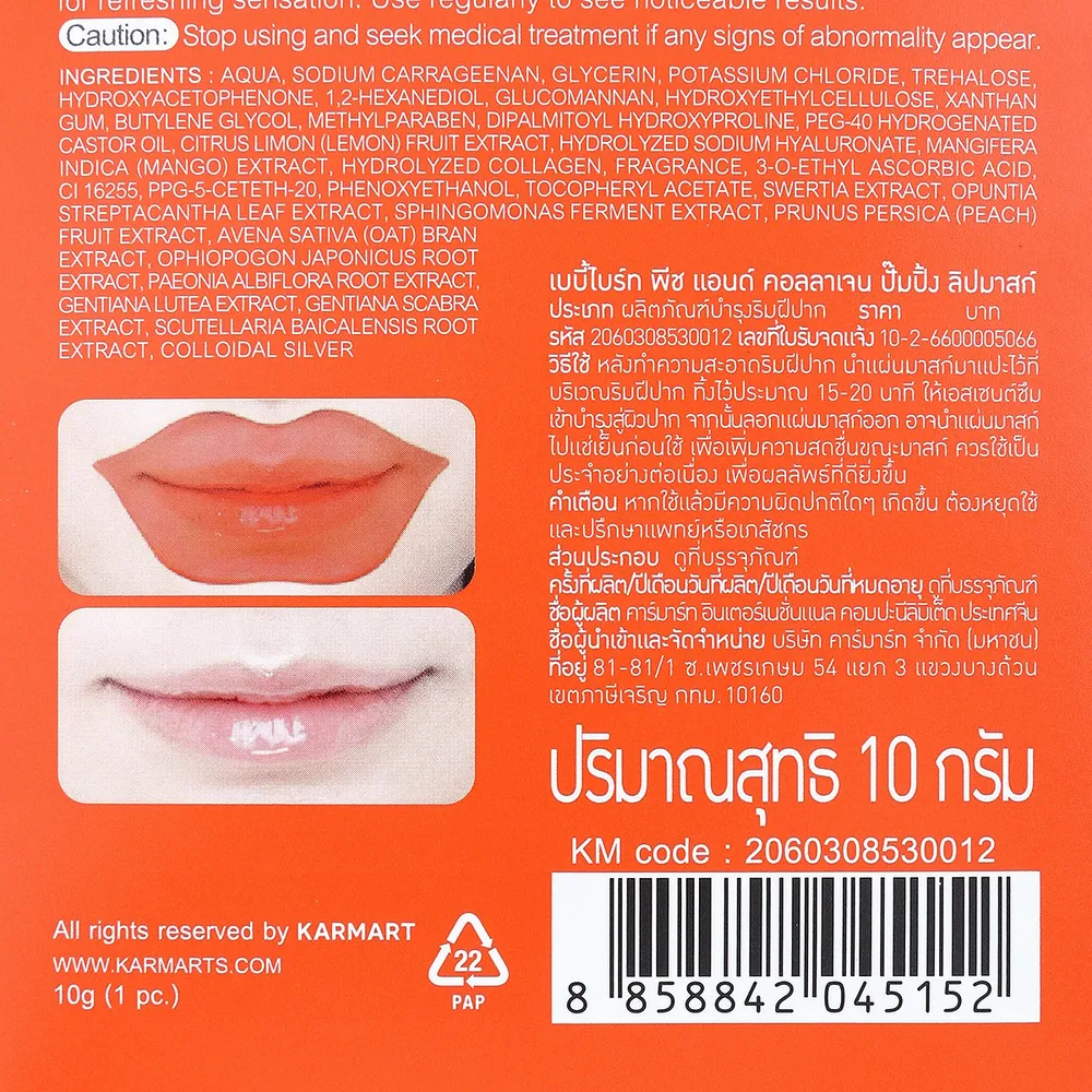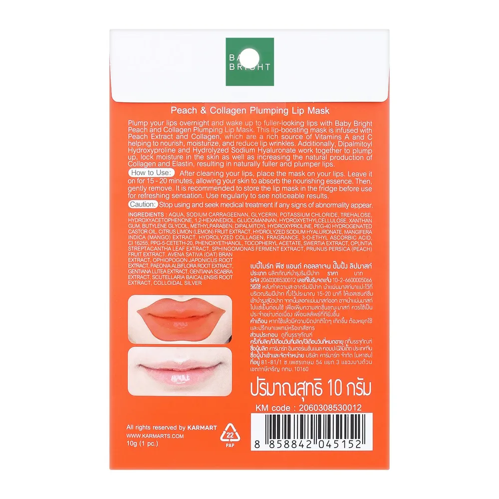บำรุงริมฝีปากให้สวย อวบอิ่ม น่าสัมผัสด้วย เบบี้ไบร์ท พีช แอนด์ คอลลาเจน ปั๊มปิ้ง ลิปมาสก์ มาสก์ริมฝีปาก ที่ผสานสารสกัดจากลูกพีช (Peach Extract) และคอลลาเจน (Collagen) อุดมไปด้วยวิตามินเอ และวิตามินซี มีสารแอนตี้ออกซิแดนท์ ที่ช่วยให้ริมฝีปากอมชมพู ชุ่มชื้น กระชับ เต่งตึง ร่องปากแลดูตื้นขึ้น ทั้งยังมีคุณประโยชน์จาก Dipalmitoyl Hydroxyproline ทำหน้าที่เป็น Lip Plumping เติมเต็มริมฝีปากให้อวบอิ่ม และผสานพลังไฮยาโมเลกุลขนาดเล็กพิเศษ (Hydrolyzed Sodium Hyaluronate) เติมเต็มและกักเก็บความชุ่มชื้น<br />