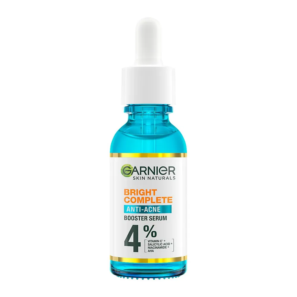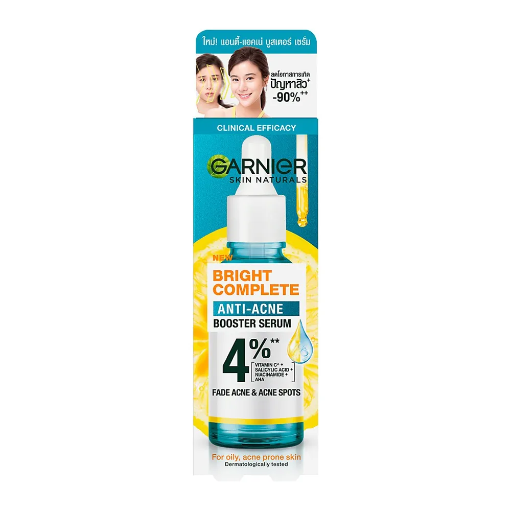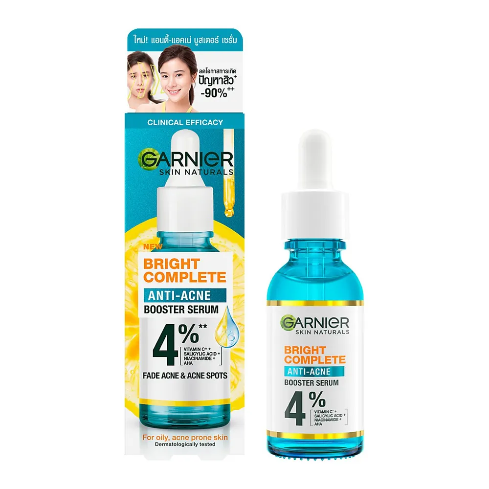 บำรุงผิวหน้าด้วย การ์นิเย่ สกิน แนทเชอรัลส์ ไบรท์ คอมพลีท แอนตี้-แอคเน่ บูสเตอร์ เซรั่ม ผลิตภัณฑ์คุณภาพจากแบรนด์ การ์นิเย่ ที่เป็นเซรั่มเพื่อผิวกระจ่างใส ด้วยการผสานพลังของวิตามินซี ซาลิไซลิค แอซิด ไนอาซีนาไมด์ และเอเอชเอ พร้อมลดเลือนรอยสิวและรอยดำ ผิวกระจ่างใสอย่างเห็นได้ชัด<br />
