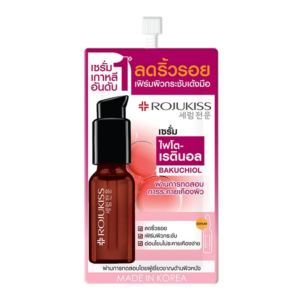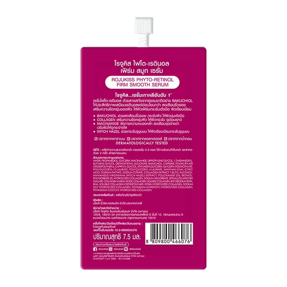 โรจูคิส ไฟโต-เรตินอล เฟิร์ม สมูท เซรั่ม ผสานสารสกัดจากธรรมชาติอย่าง BAKUCHIOL ให้ประสิทธิภาพเสมือนเรตินอล แต่อ่อนโยนกว่า ช่วยในการลดเลือนริ้วรอย เสริมความยืดหยุ่น ให้ผิวเฟิร์ม กระชับเด้งมือ ผิวเรียบเนียน<br />