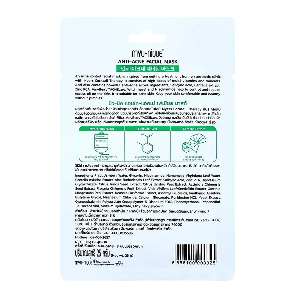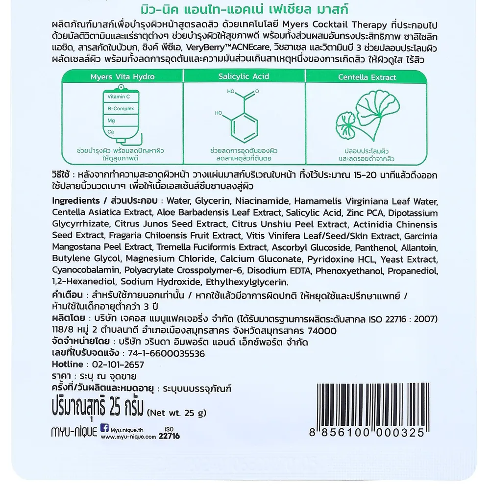 ผลิตภัณฑ์มาส์กจากแบรนด์ มิวนิค เพื่อบำรุงผิวหน้าสูตรลดสิว ด้วยเทคโนโลยี Myers Cocktail Therapy ที่ประกอบไปด้วยมัลติวิตามินและแร่ธาตุต่างๆ ช่วยบำรุงผิวให้สุขภาพดี พร้อมทั้งส่วนผสมอันทรงประสิทธิภาพ ซาลิไซลิก แอซิด, สารสกัดใบบัวบก, ซิงค์ พีซีเอ, VeryBerry&trade;ACNEcare, วิชฮาเซล และวิตามินบี 3 ช่วยปลอบประโลมผิว ผลัดเซลล์ผิว พร้อมทั้งลดการอุดตันและความมันส่วนเกินสาเหตุหนึ่งของการเกิดสิว ให้ผิวดูใส ไร้สิว<br />