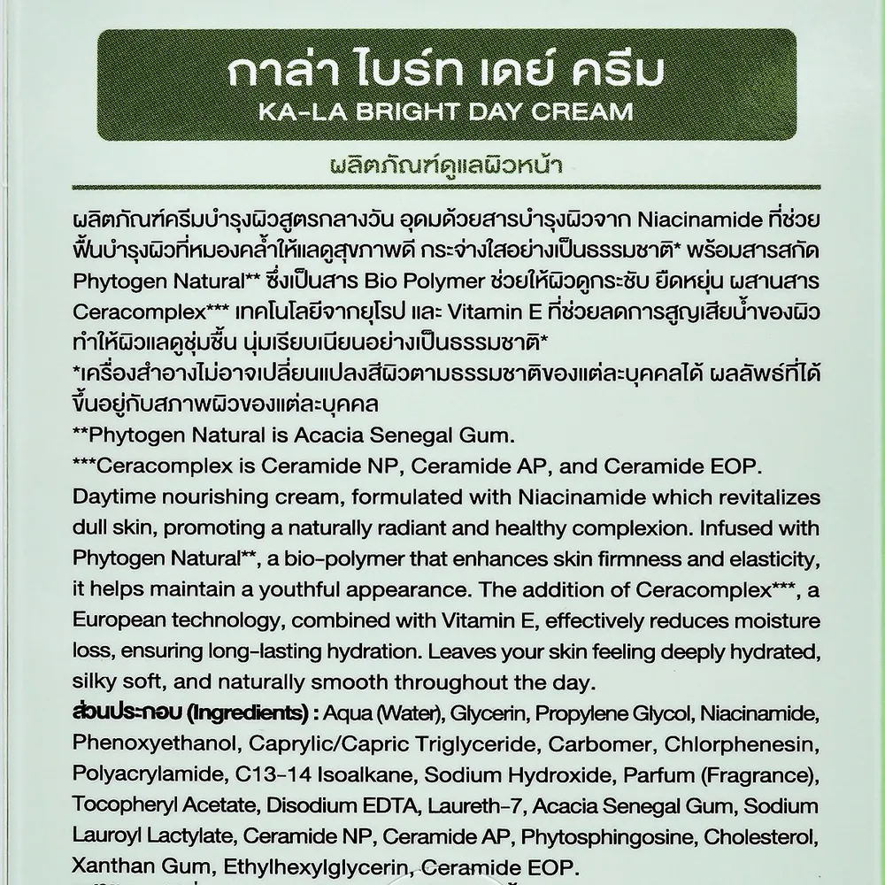 กาล่า ผลิตภัณฑ์ครีมบำรุงผิวสูตรกลางวัน อุดมด้วยสารบำรุงผิวจาก Niacinamide ที่ช่วยฟื้นบำรุงผิวที่หมองคล้ำให้แลดูสุขภาพ กระจ่างใสอย่างเป็นธรรมชาติ Phytogen Natural ซึ่งเป็นสาร Bio Polymer ช่วยให้ผิวดูกระชับ ยืดหยุ่น<br />