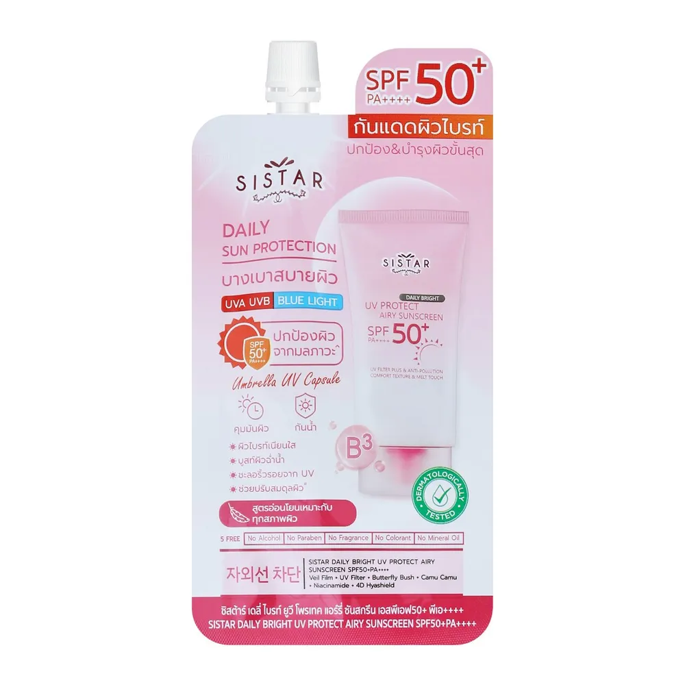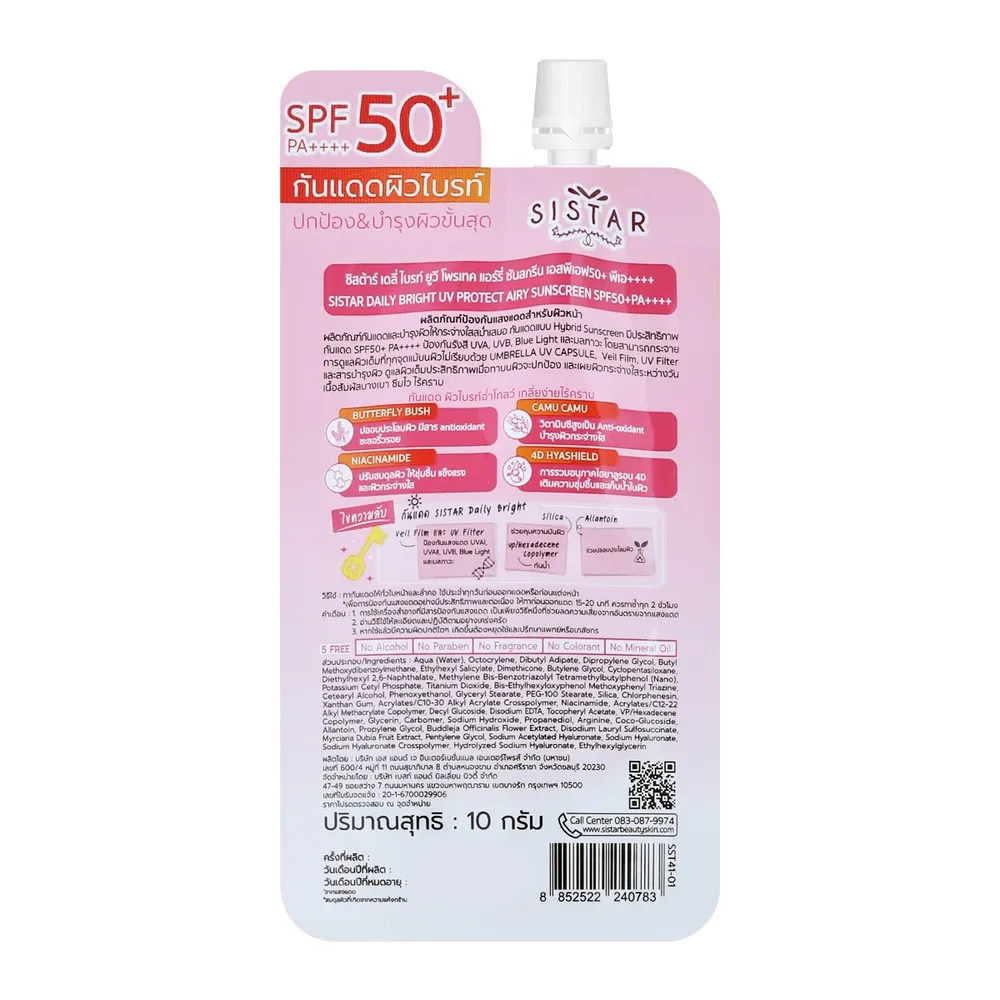 ซิสต้าร์ เดลี่ ไบรท์ ยูวี โพรเทค แอร์รี่ ซันสกรีน เอสพีเอฟผลิตภัณฑ์กันแดดและบำรุงผิวให้กระจ่างใสสม่ำเสมอ กันแดดแบบ Hybrid Sunscreen มีประสิทธิภาพกันแดด SPF50บวก PAบวก ป้องกันรังสี UVA UVB Blue Light และมลภาวะ<br />