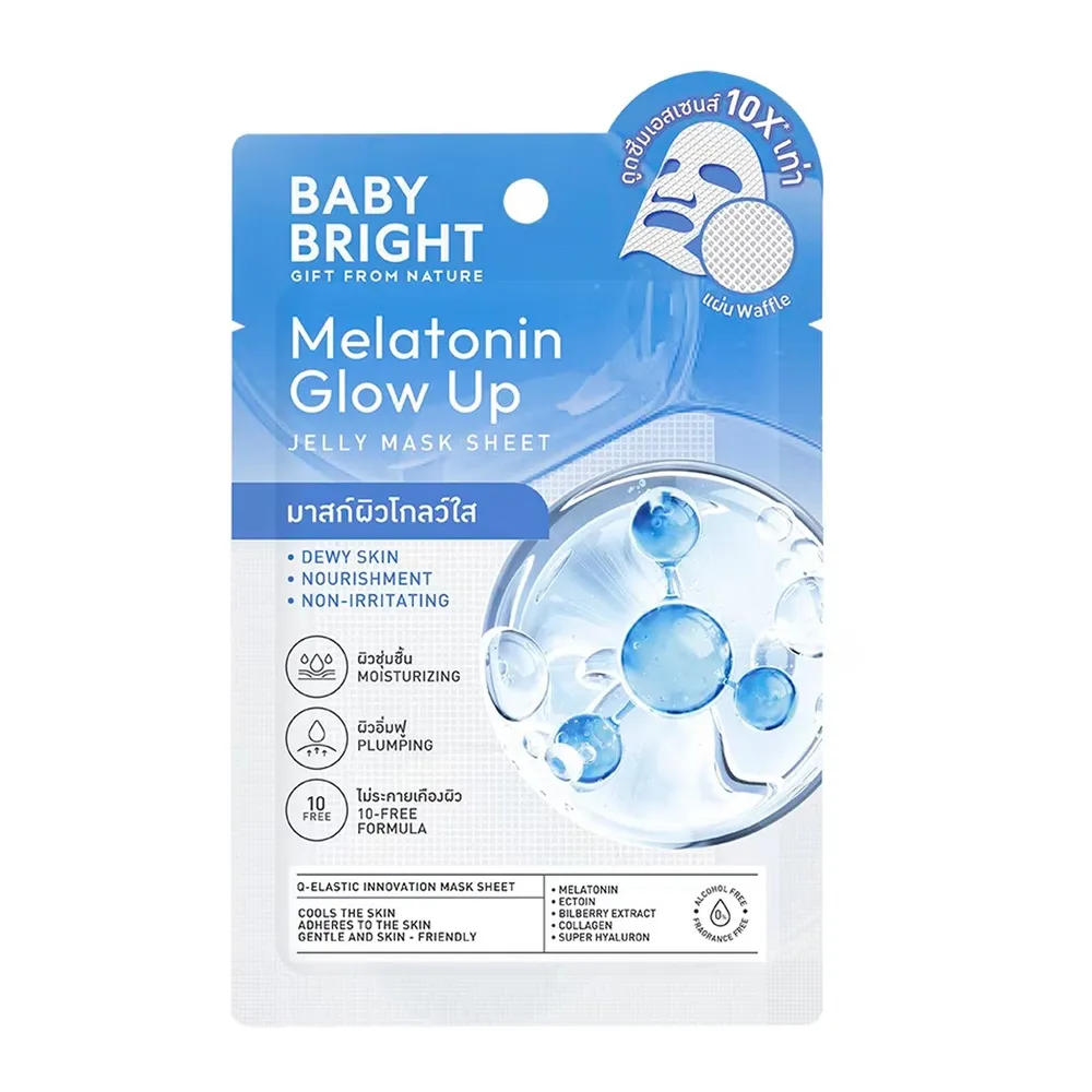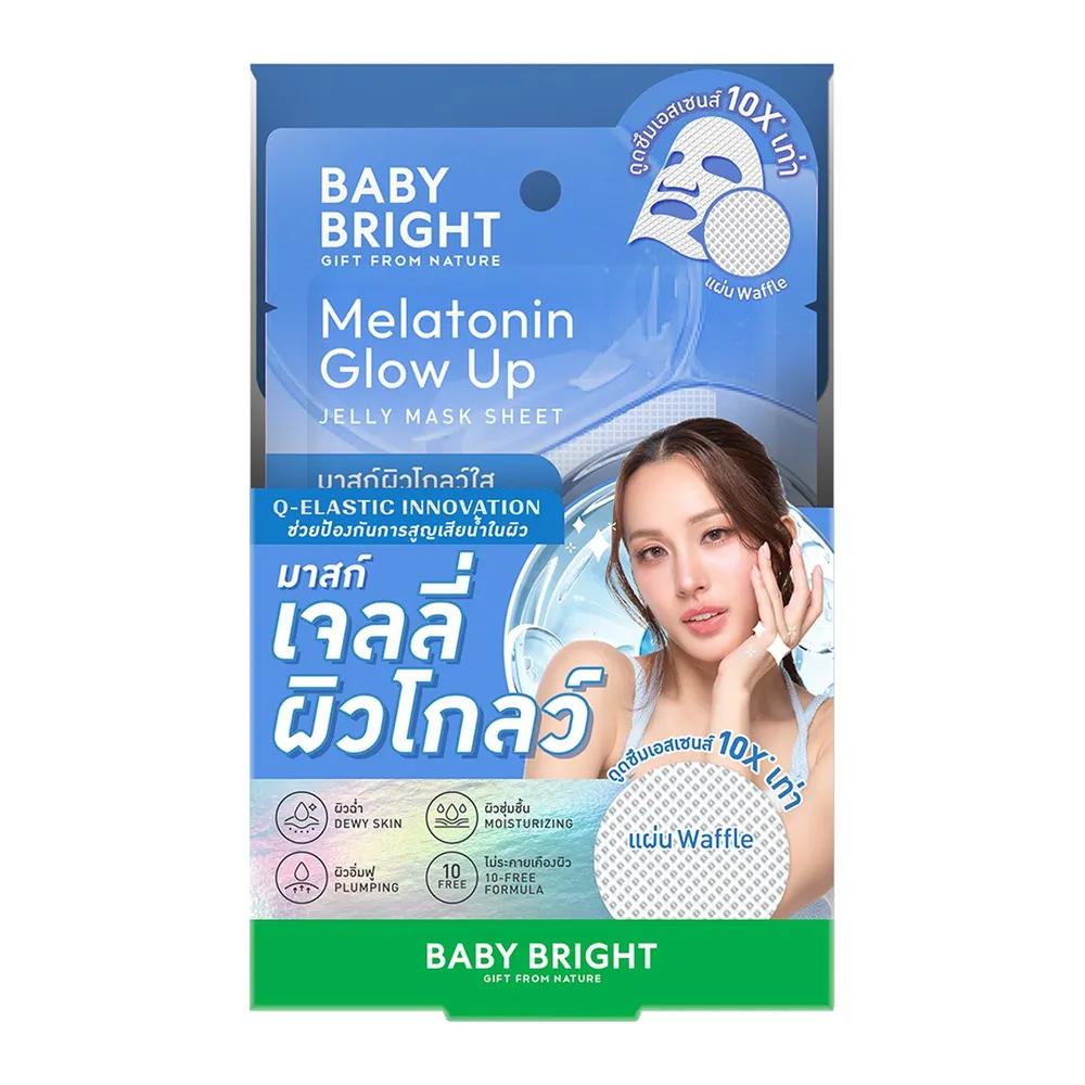 เบบี้ไบร์ท&nbsp; เมลาโทนินโกลว์อัพเจลลี่มาสก์ชีท แผ่นมาสก์นวัตกรรม Q-Elastic มาสก์เนื้อใสเหมือนเจลลี่ ช่วยป้องกันการสูญเสียน้ำในผิว ดูดซึมเอสเซนส์ได้มากถึง 10 เท่า! เย็นสดชื่น สบายผิว ยึดเกาะบนผิวหน้าแนบสนิทเสมือนชั้นผิว แผ่นมาสก์ทำจากเส้นใยธรรมชาติ อ่อนโยน และเป็นมิตรกับผิว<br />