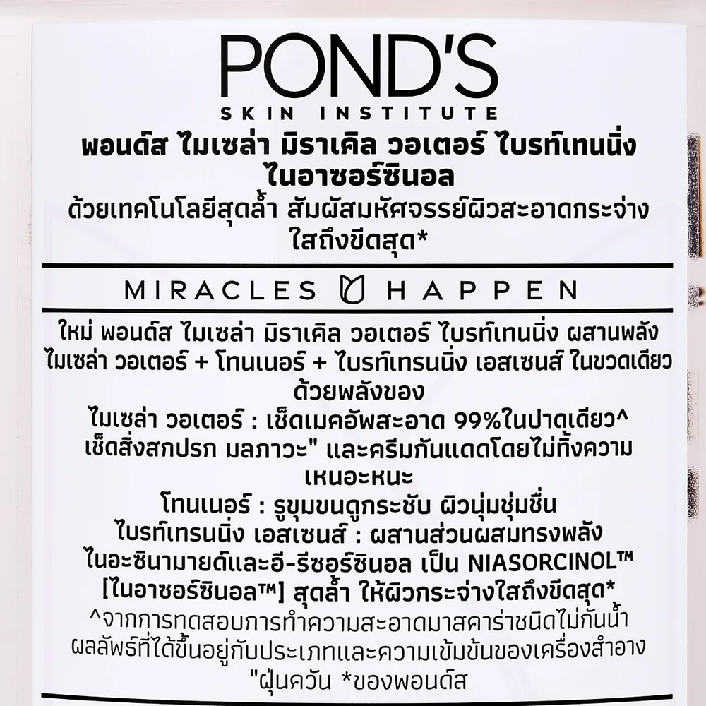ใหม่ พอนด์ส ไมเซล่า มิราเคิล วอเตอร์ ไบรท์เทนนิ่ง ผสานพลัง ไมเซล่า วอเตอร์ + โทนเนอร์ + ไบรท์เทนนิ่ง เอสเซนส์ ในขวดเดียว<br />