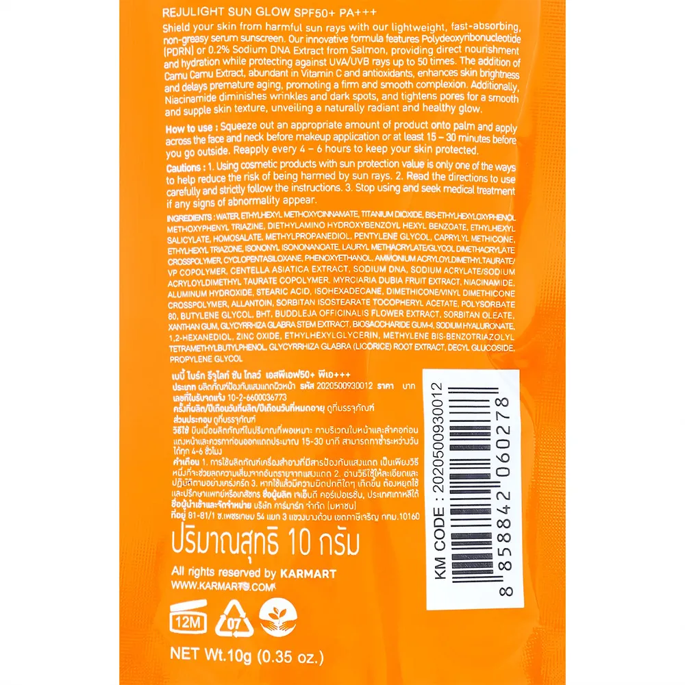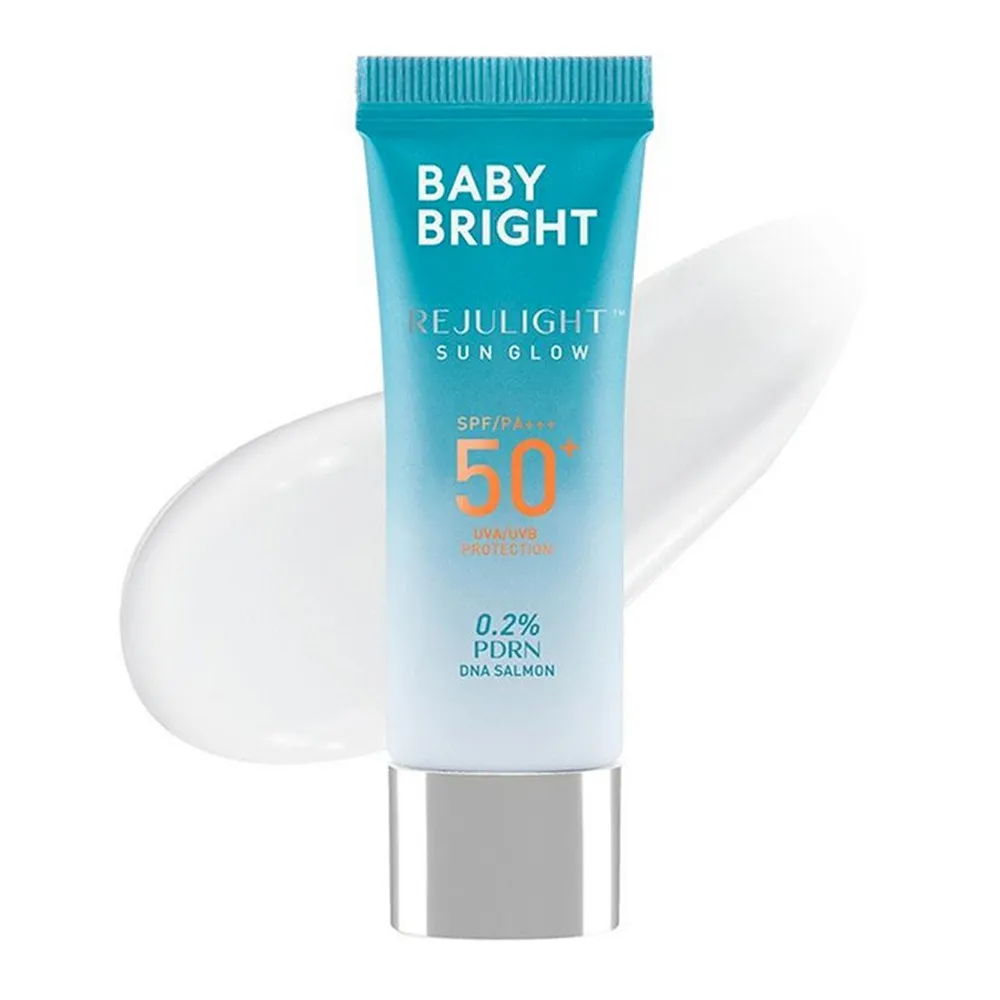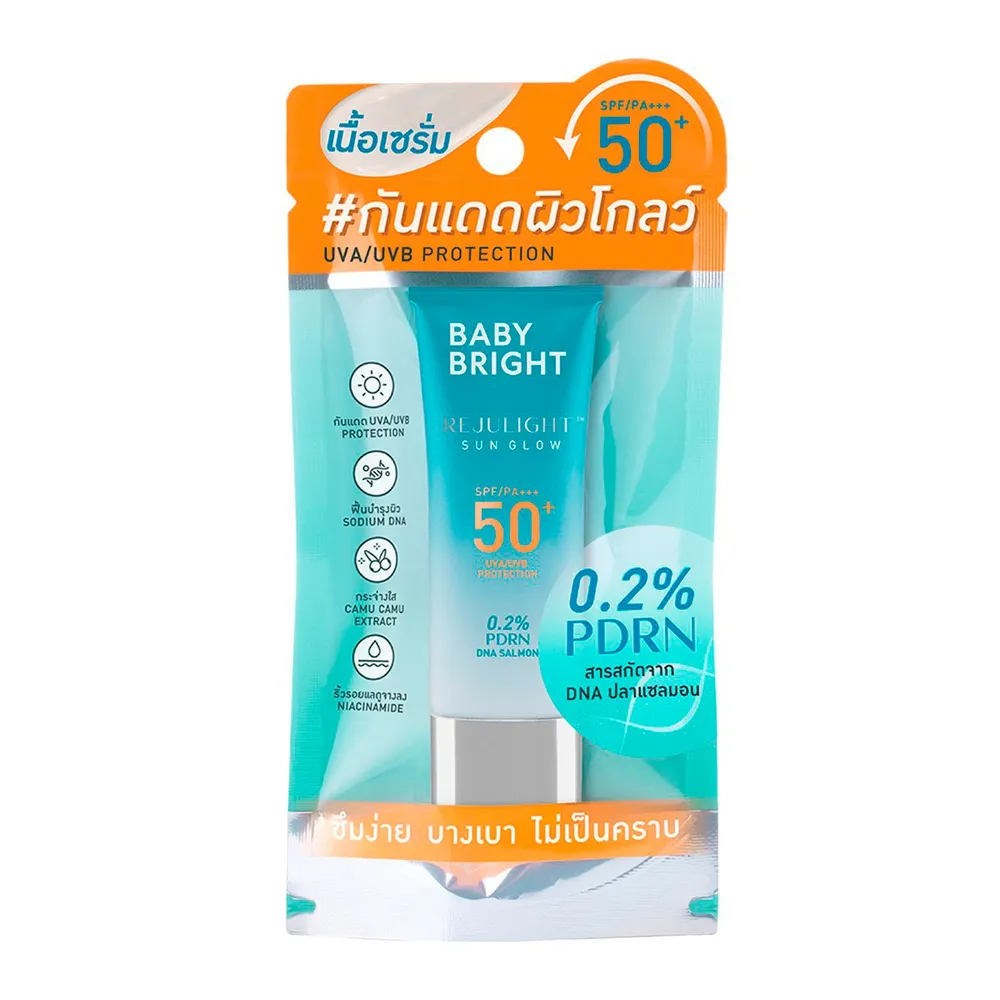 เบบี้ไบร์ท รีจูไลท์ ซัน โกลว์ SPF50+ PA+++ กันแดดเนื้อเซรั่ม ซึมง่าย บางเบา ไม่เป็นคราบ มาพร้อมนวัตกรรมการฟื้นฟูผิวด้วยสารสกัด Polydeoxyribonucleotide (PDRN) หรือสารสกัด Sodium DNA จากปลาแซลมอน 0.2% สู่ผลิตภัณฑ์กันแดดผิวหน้ารีจูไลท์ซันโกลว์<br />