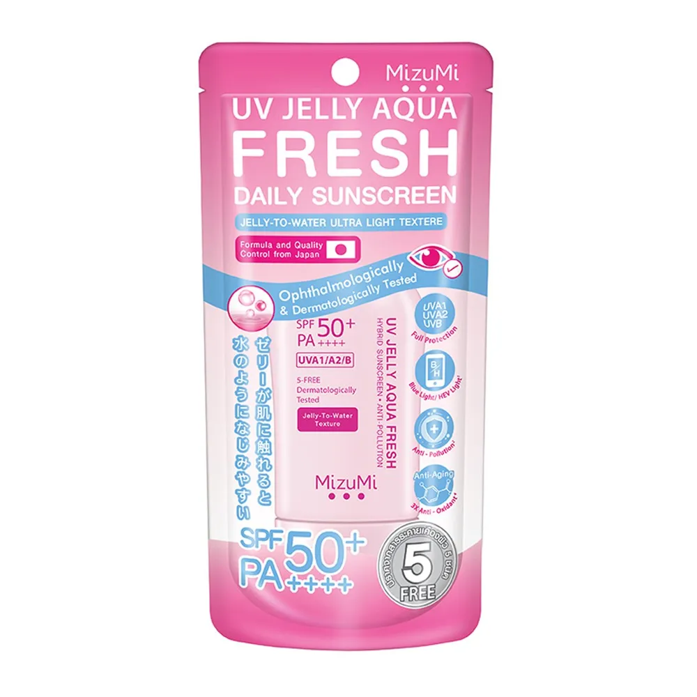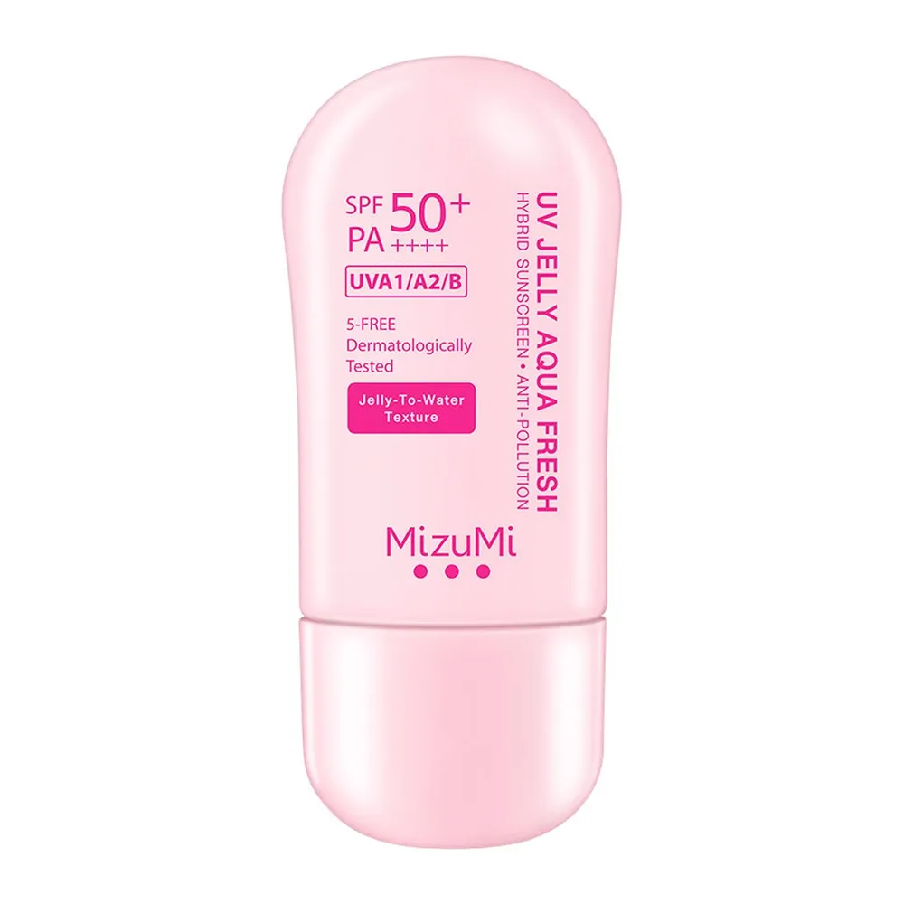 มิซึมิ ยูวี เจลลี่ อควาเฟรช ครีมกันแดดสูตรเนื้อเจลลี่ทูวอเตอร์ ให้ความสดชื่นและช่วยให้ผิวดูกระจ่างใส ปกป้องแม้ร่องผิวที่ลึกที่สุด ปกป้องผิวหมองคล้ำ ฝ้ากระ จุดด่างดำที่เกิดจากแสงแดด UVA1/A2/B ที่แข็งแกร่ง<br />