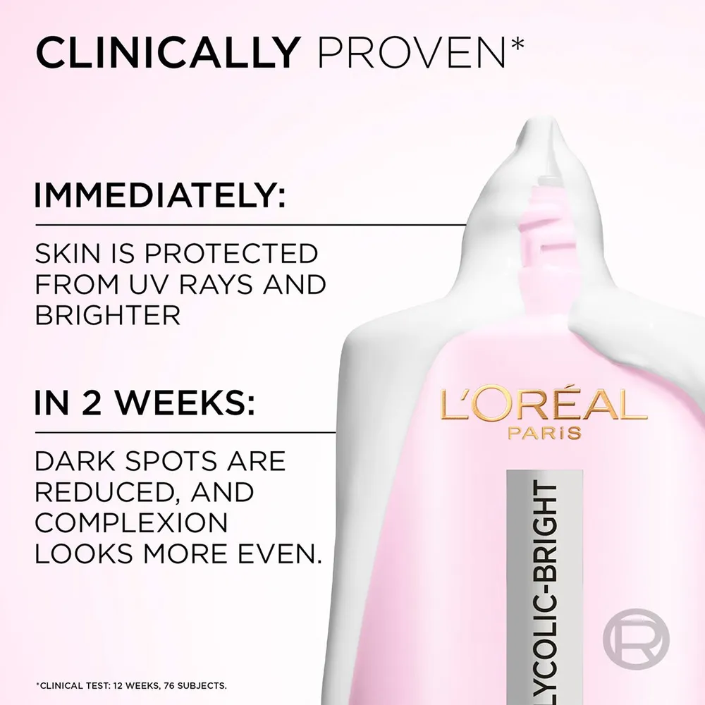 ลอรีอัล ปารีส ผลิตภัณฑ์ป้องกันแสงแดด เพื่อผิวดูโกลว์และกระจ่างใสขึ้นในทันที ไกลโคลิค-ไบรท์ แอนไท-ดาร์ก สปอต เดลี่ ยูวี ฟลูอิด เอสพีเอฟ 50+ ผสานด้วยไกลโคลิค แอซิด + ไนอะซินาไมด์ ช่วยเพิ่มเกราะปกป้องผิวทันที ป้องกันการเกิดจุดด่างดำหลายรูปแบบ+ ไกลโคลิค แอซิด ช่วยผลัดเซลล์ผิว อย่างอ่อนโยน ช่วยลดเลือนความหมองคล้ำ ไนอะซินาไมด์ ช่วยลดเลือนจุดด่างดำ ทำไมถึงควรเพิ่ม แอนไท-ดารก์ สปอต เดลี่ ยูวี ฟลูอิด เข้าไปในขึ้นตอนการบำรุงผิวร่วมกับผลิตภัณฑ์ไกลโคลิค-ไบรท์อื่น ๆ<br />