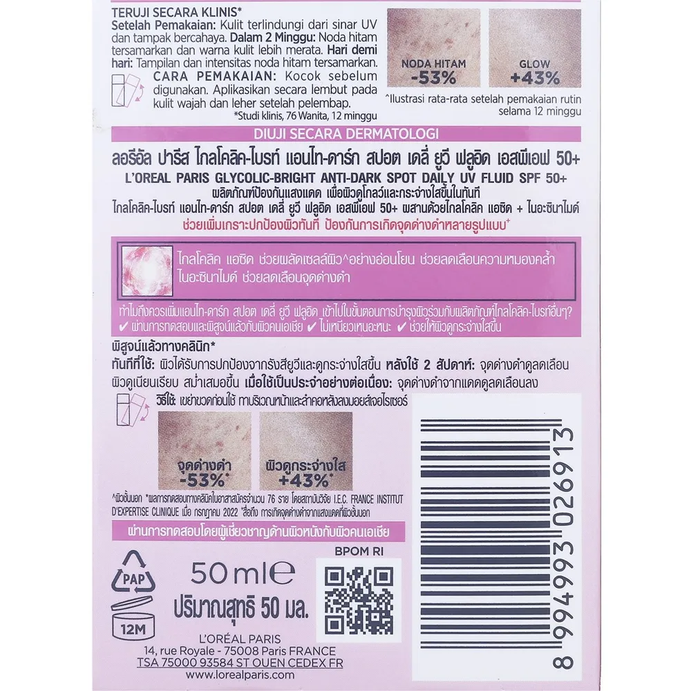 ลอรีอัล ปารีส ไกลโคลิค-ไบรท์ แอนไท-ดาร์ก สปอต เดลี่ ยูวี ฟลูอิด เอสพีเอฟ 50+ 50 มล.