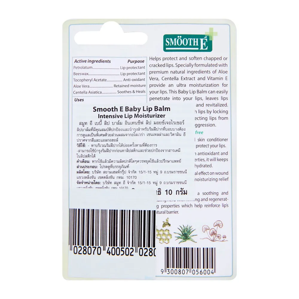 <p>สมูทอี เบบี้ ลิปบาล์ม<br /><br />สมูทอี เบบี้ ลิปบาล์ม ช่วยปกป้องริมฝีปากจากสารเคมี ให้ริมฝีปากนุ่มอวบอิ่ม ไม่ดำคล้ำ ชุ่มชื้นอย่างเป็นธรรมชาติ ปราศจากการแต่งสี และแอลกอฮอล์ อ่อนโยน ไม่ระคายเคือง<br /><br />- สมูทอี เบบี้ ลิปบาล์ม<br />- ช่วยปกป้องริมฝีปากจากสารเคมี<br />- ริมฝีปากนุ่มอวบอิ่ม ไม่ดำคล้ำ ชุ่มชื้นอย่างเป็นธรรมชาติ<br />- ปราศจากการแต่งสี และแอลกอฮอล์ อ่อนโยน ไม่ระคายเคือง<br /><br /><strong>เลขที่ใบรับแจ้ง</strong><br />10-1-5800205<br /><br /><span style="color: #ff0000;">*บริษัทฯ ขอสงวนสิทธิ์ในการปรับเปลี่ยนราคาจำหน่ายและโปรโมชั่น รวมถึงแพ็คเกจและปริมาณสินค้าจากผู้ผลิตได้ตามความเหมาะสม โดยไม่จำเป็นต้องแจ้งให้ทราบล่วงหน้า</span><br /><br />*ภาพประกอบใช้เพื่อการโฆษณาเท่านั้น</p>