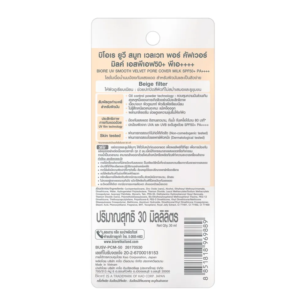 บิโอเร ครีมกันแดด สมูท เวลเวท ยูวี เบจฟิลเตอร์ SPF50+ PA++++ 30 มล.