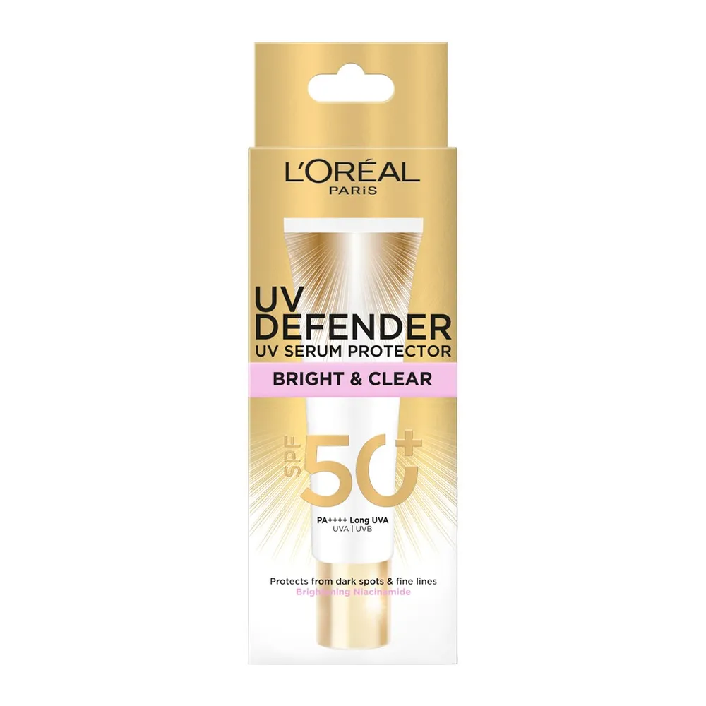 ปกป้องผิวจากแสงแดดด้วย ลอรีอัล ปารีส ยูวี ดีเฟนเดอร์ ไบรท์ แอนด์ เคลียร์ เอสพีเอฟ 50+ พีเอ++++ ลอง ยูวีเอ ผลิตภัณสำหรับผิวหน้าคุณภาพจากแบรนด์ ลอรีอัล ปารีส ที่เป็นเนื้อเซรั่ม บางเบา ซึมซาบเร็ว ปกป้องผิวจากริ้วรอยแห่งวัยจากแสงแดด ช่วยให้ผิวกระจ่างใส<br />