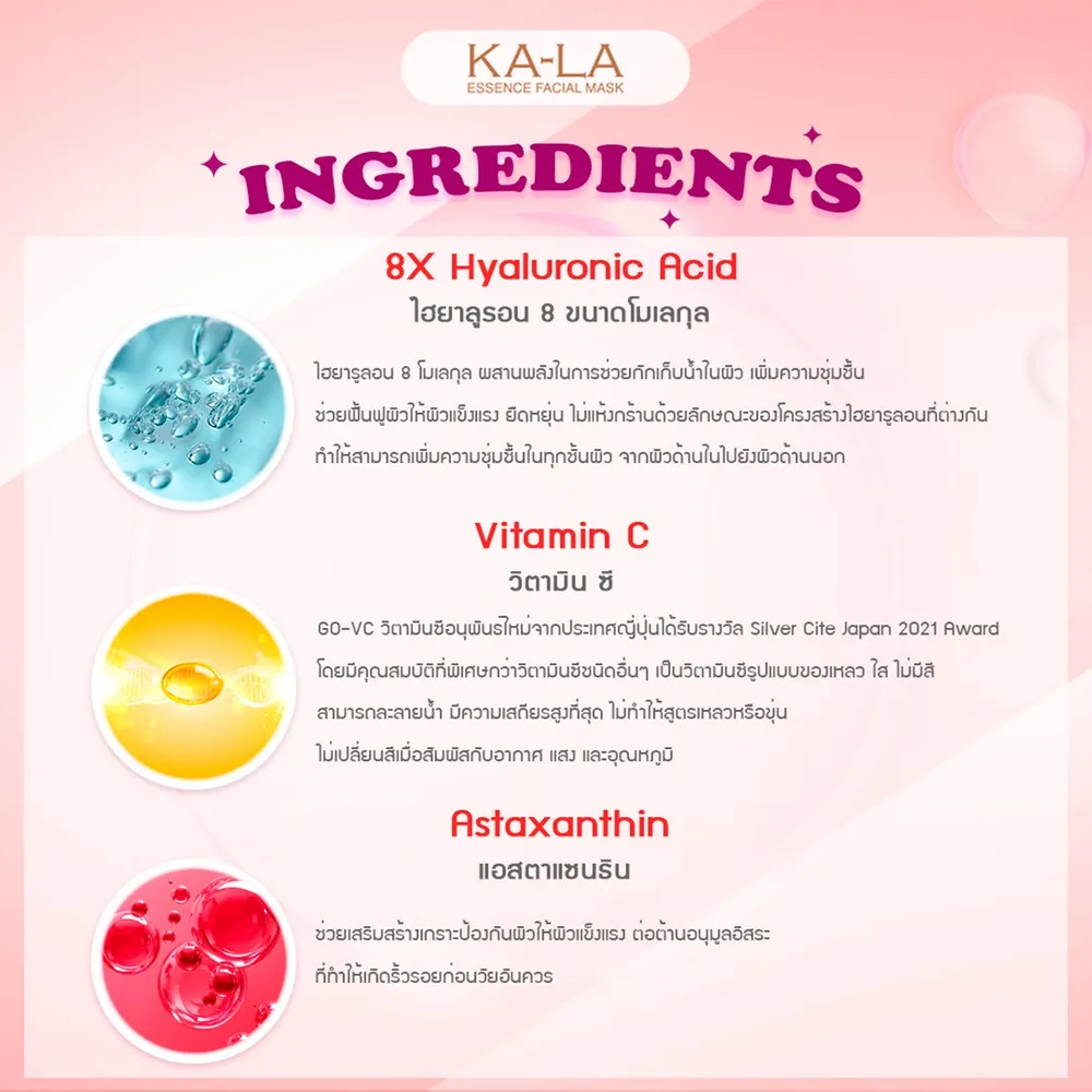 - ผสานการบำรุงผิวจากแอสต้าแซนทีนซึ่งเป็นสารแอนตี้ออกซิแดนซ์จากธรรมชาติที่มีวิตามิน E สูง พร้อมอนุพันธ์ของวิตามิน C ใหม่ล่าสุดจากญี่ปุ่น และไฮยาลูรอน 8 โมเลกุล<br />