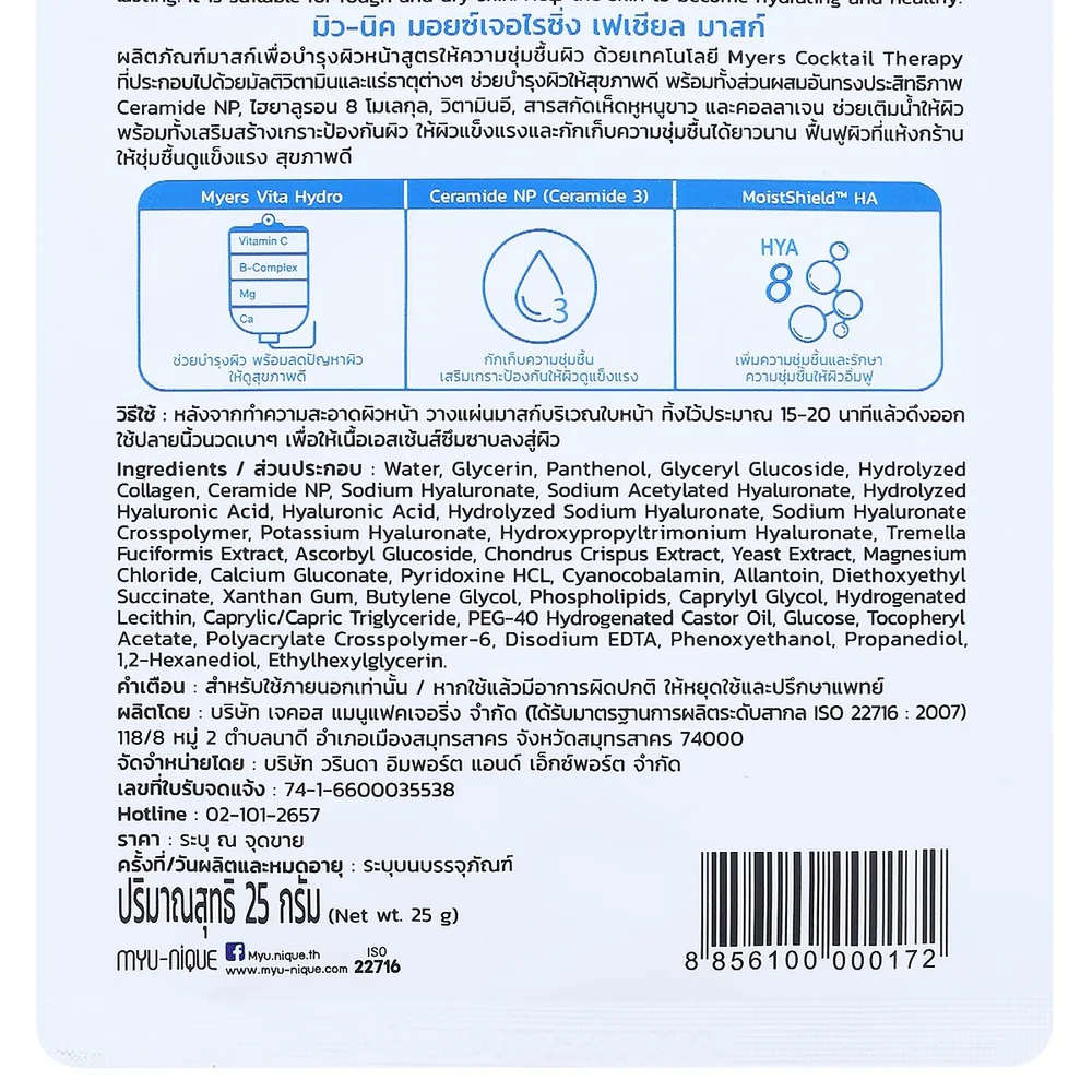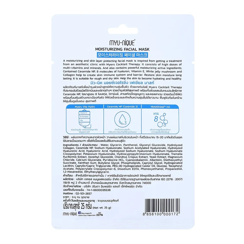 ผลิตภัณฑ์มาส์กจากแบรนด์ มิวนิค เพื่อบำรุงผิวหน้าสูตรให้ความชุ่มชื้นผิว ด้วยเทคโนโลยี Myers Cocktail Therapy ที่ประกอบไปด้วยมัลติวิตามินและแร่ธาตุต่างๆ ช่วยบำรุงผิวให้สุขภาพดี พร้อมทั้งส่วนผสมอันทรงประสิทธิภาพ Ceramide NP, ไฮยาลูรอน 8 โมเลกุล, วิตามินอี, สารสกัดเห็ดหูหนูขาว และคอลลาเจน ช่วยเติมน้ำให้ผิว พร้อมทั้งเสริมสร้างเกราะป้องกันผิว ให้ผิวแข็งแรงและกักเก็บความชุ่มชื้นได้ยาวนาน ฟื้นฟูผิวที่แห้งกร้าน ให้ชุ่มชื้น แข็งแรง สุขภาพดี<br />