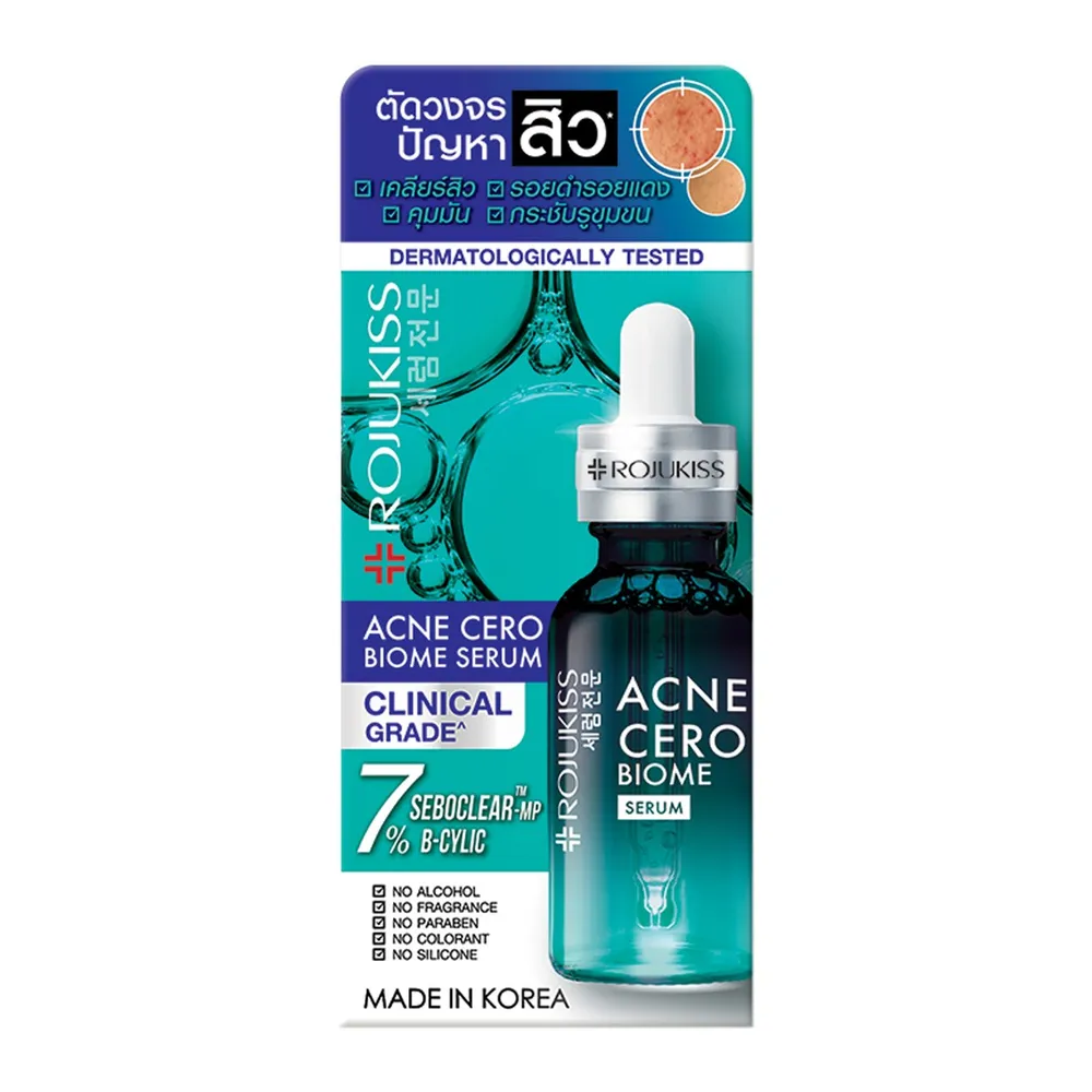 โรจูคิส แอคเน่ เซโร่ ไบโอม เซรั่ม ผลิตภัณฑ์บำรุงผิวหน้าสำหรับผู้มีปัญหาสิว ผิวมัน รอยสิวซ้ำซาก เนื้อบางเบาซึมซาบเร็ว&nbsp;ผ่านการทดสอบการระคายเคืองต่อผิว<br />